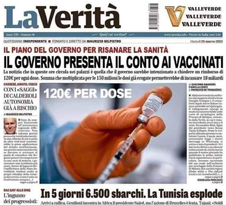 Με βάση όλα τα διαθέσιμα στοιχεία, ο ισχυρισμός ότι πρωτοσέλιδο της ιταλικής εφημερίδας LaVerità αναφέρει σχέδιο της ιταλικής κυβέρνησης να χρεώσει 120 ευρώ ανά δόση σε κάθε εμβολιασμένο πολίτη είναι ψευδής. Η εικόνα του πρωτοσέλιδου που παρουσιάζεται στα εξεταζόμενα δημοσιεύματα είναι προϊόν ψηφιακής επεξεργασίας, με το πραγματικό πρωτοσέλιδο της 28ης Μαρτίου 2023 να έχει ως πρώτο θέμα το οικονομικό σκάνδαλο Qatargate. Συμπληρωματική αναζήτηση σε επίσημες σελίδες της κυβέρνησης και μεγάλα μέσα ενημέρωσης δεν έδωσε κανένα αποτέλεσμα για σχέδιο της κυβέρνησης να χρεώσει εμβολιασμένους πολίτες.