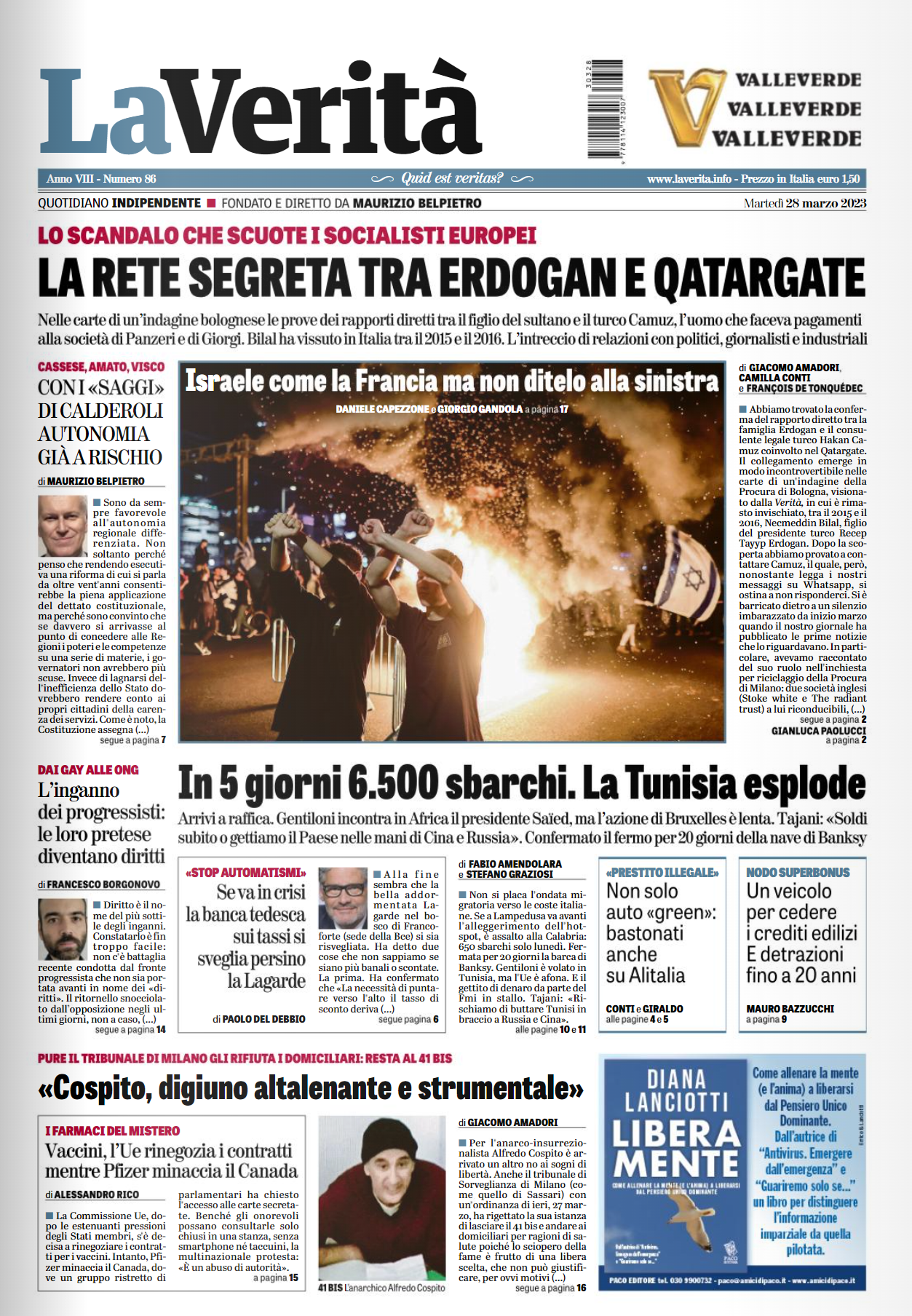 Τα εξεταζόμενα δημοσιεύματα παρουσιάζουν ως απόδειξη του ισχυρισμού την φωτογραφία από το πρωτοσέλιδο της ιταλικής εφημερίδας LaVerità για τις 28 Μαρτίου 2023. Σύμφωνα με την εικόνα που παραθέτουν τα δημοσιεύματα, το πρωτοσέλιδο αναφέρει τα εξής: