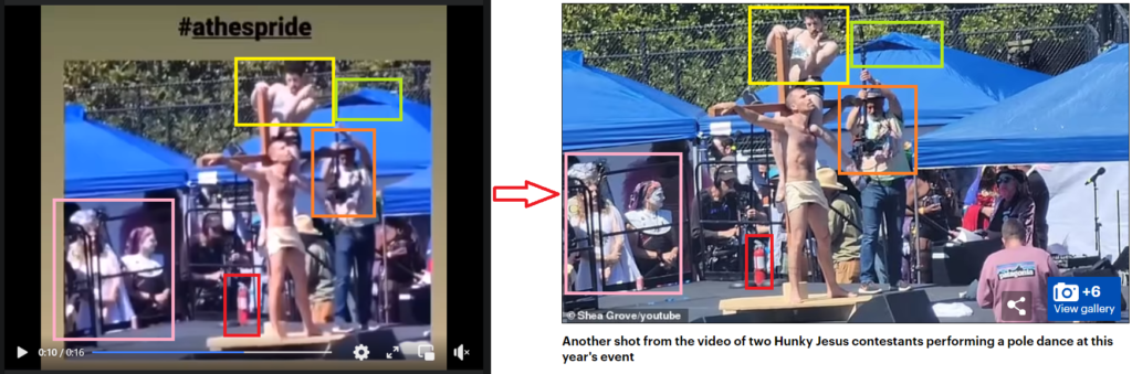 Πιο συγκεκρικένα, εντοπίσαμε πανομοιότυπα στιγμιότυπα σε άρθρο της Daily Mail, στο οποίο αναφέρεται πως τα εν λόγω πλάνα προέρχονται από μια εκδήλωση με τίτλο “Hunky Jesus” που έγινε στο Σαν Φρανσίσκο τον περασμένο Απρίλιο, και διοργανώθηκε από μια ομάδα Drag καλλιτεχνών με την ονομασία “The Sisters of Perpetual Indulgence” η οποία οργανώνει διαμαρτυρίες και παραστάσεις στο δρόμο για φιλανθρωπικούς σκοπούς από τη δεκαετία του 70′. Η πραγματοποίηση της εκδήλωσης “Hunky Jesus” στις 9 Απριλίου 2023 αναφέρεται και σε τοπική σελίδα ενημέρωσης του Σαν Φρανσίσκο καθώς και σε βίντεο ρεπορτάζ του ABC7 στο YouTube.