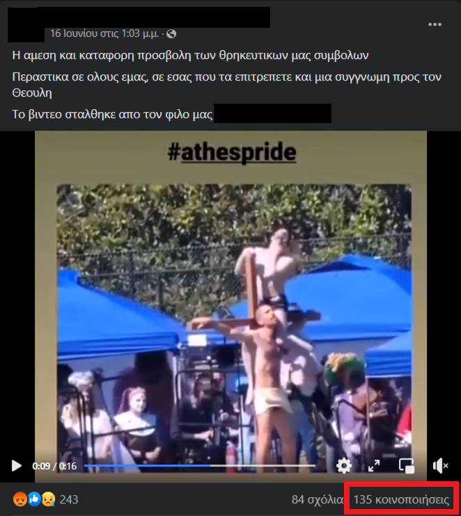 Αρχικά, παρότι το hashtag #athespride που είναι ενσωματωμένο στο εξεταζόμενο βίντεο έχει τυπογραφικό λάθος, από στιγμιότυπο στην αρχή του βίντεο, αλλά και ποικίλα σχόλια που βλέπουμε στην επίμαχη ανάρτηση, είναι σαφής ο ισχυρισμός ότι η εικονιζόμενη παράσταση έλαβε χώρα κατά τη διάρκεια της πορείας Υπερηφάνειας που έγινε στην Αθήνα τον Ιούνιο του 2023 (Athens Pride).