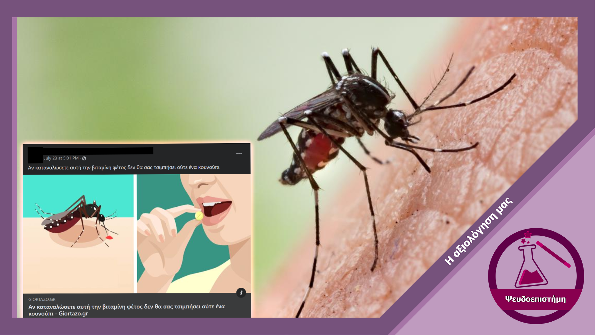 Σε ιστοσελίδες μέσων ενημέρωσης και μέσα κοινωνικής δικτύωσης κυκλοφόρησε ο ισχυρισμός ότι η κατανάλωση της βιταμίνης B1 λειτουργεί ως απωθητικό κουνουπιών. Ωστόσο, ο εν λόγω ισχυρισμός δεν υποστηρίζεται από τα διαθέσιμα δεδομένα.