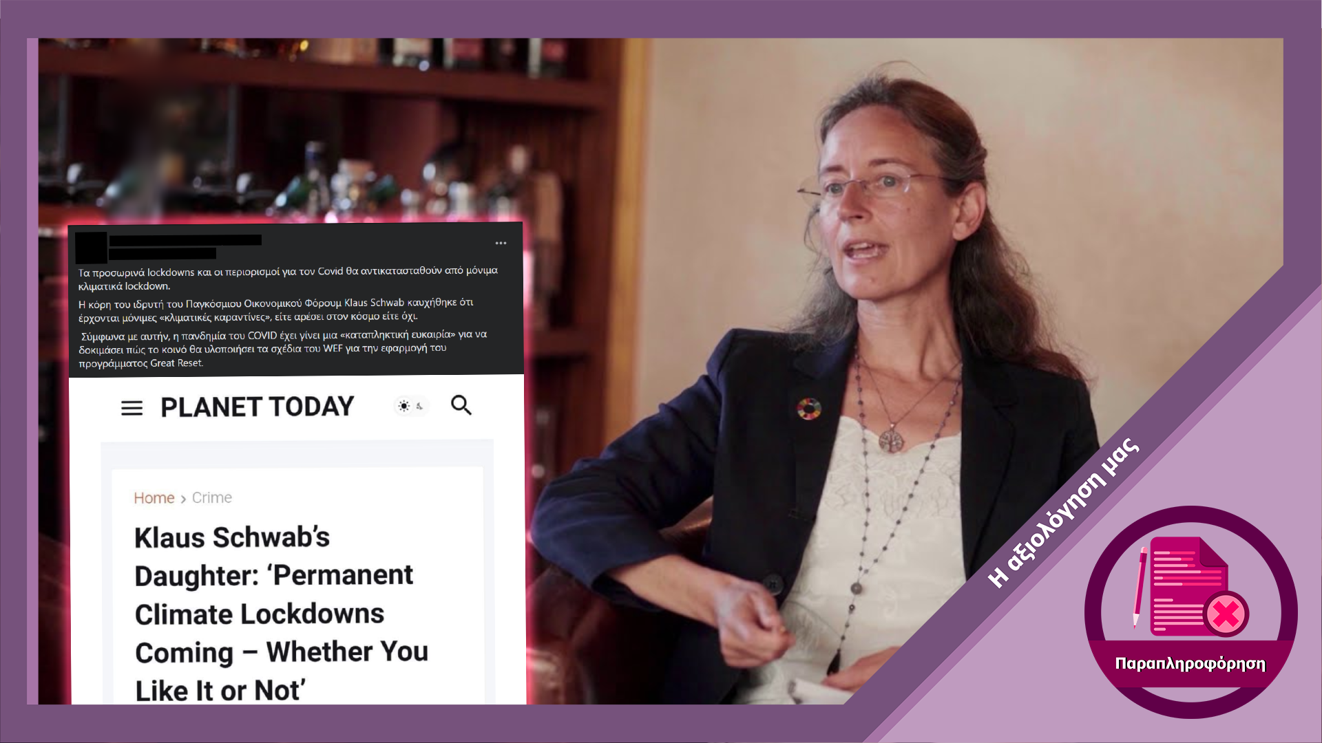 Σε αναρτήσεις ιστολογίων και λογαριασμών στα μέσα κοινωνικής δικτύωσης κυκλοφόρησε ο ισχυρισμός ότι η Nicole Schwab, κόρη του ιδρυτή του World Economic Forum Klaus Schwab, είπε σε ομιλία της ότι πρόκειται να εφαρμοστούν υποχρεωτικά, μόνιμα, κλιματικά lockdown στο πλαίσιο αντιμετώπισης της κλιματικής αλλαγής. Ωστόσο, ο εν λόγω ισχυρισμός είναι ψευδής καθώς δεν έγινε καμία τέτοια αναφορά στην εν λόγω ομιλία ή σε οποιαδήποτε άλλη δήλωση της Nicole Schwab ή του World Economic Forum.