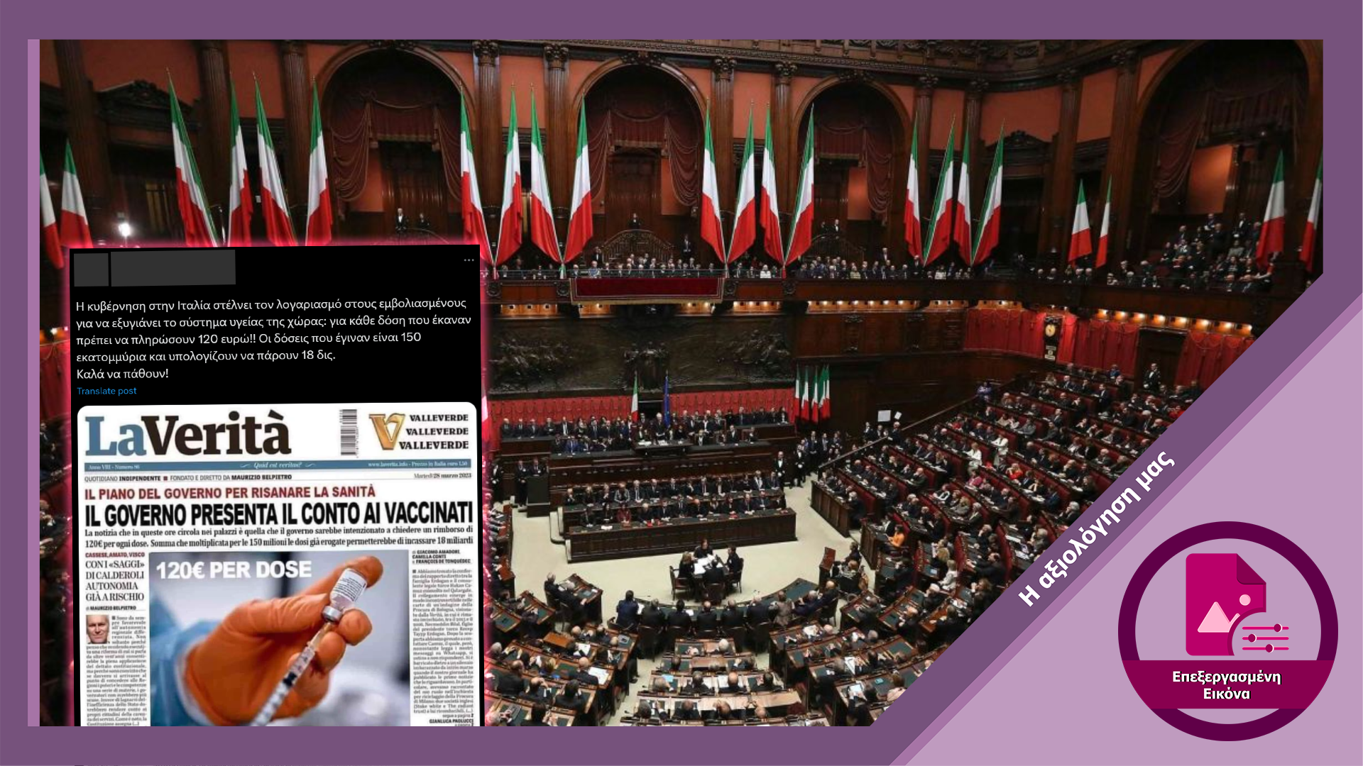 Δημοσιεύματα σε ιστολόγια και αναρτήσεις στα μέσα κοινωνικής δικτύωσης αναπαράγουν τον ισχυρισμό ότι η ιταλική κυβέρνηση ξεκίνησε να στέλνει λογαριασμούς 120 ευρώ ανά δόση σε κάθε πολίτη που εμβολιάστηκε για την COVID-19. Ωστόσο, η εικόνα από το πρωτοσέλιδο ιταλικής εφημερίδας που παρουσιάζεται ως απόδειξη του ισχυρισμού έχει υποστεί ψηφιακή επεξεργασία.