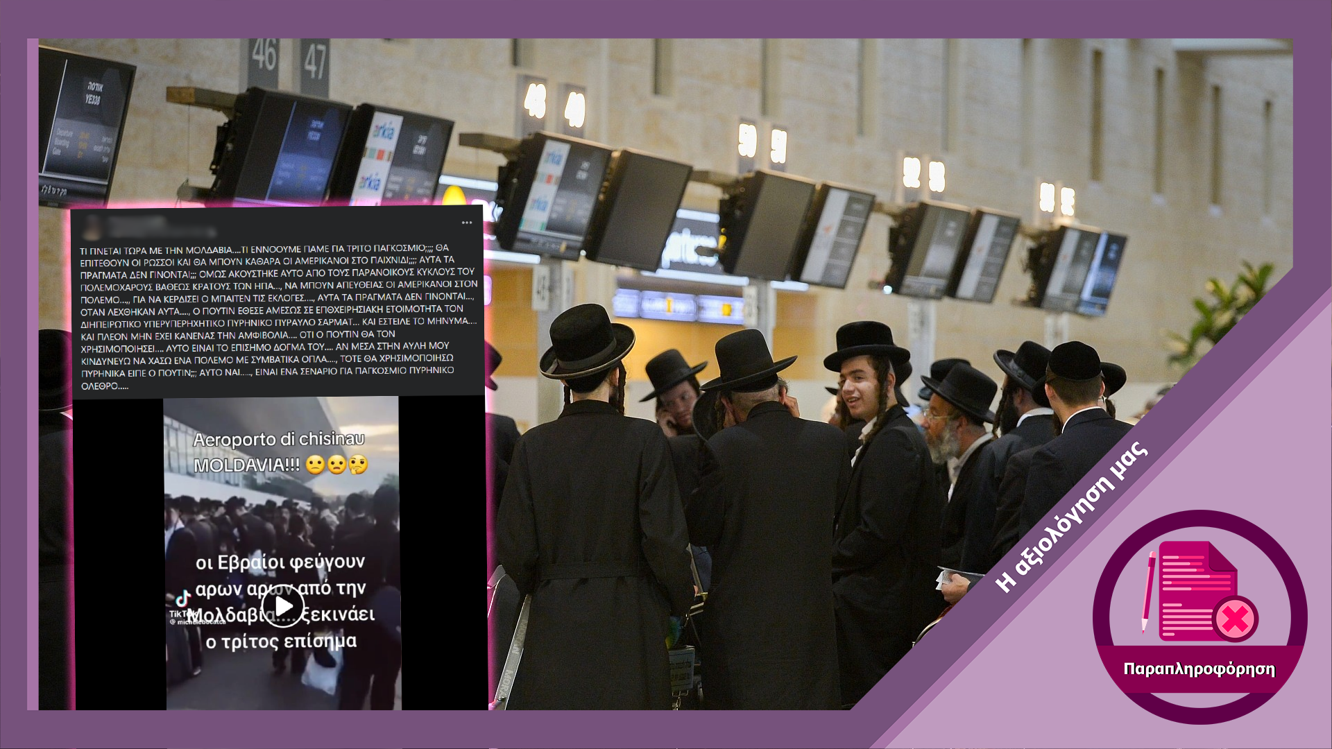 Σε λογαριασμούς μέσων κοινωνικής δικτύωσης κυκλοφορεί βίντεο από το TikTok στο οποίο εμφανίζεται μια ομάδα χασιδιστών Εβραίων, με το κείμενο που συνοδεύει το βίντεο να αναφέρει ότι πρόκειται για εσπευσμένη έξοδο από την Μολδαβία προς αποφυγή κάποιου πολέμου ή μεγάλης καταστροφής. Ωστόσο, ο εν λόγω ισχυρισμός είναι ψευδής καθώς αυτές οι ομάδες δεν είναι πολίτες που εγκαταλείπουν την χώρα λόγω φόβου, αλλά ταξιδιώτες που επιστρέφουν από την Ουκρανία κατόπιν εορτασμού του εβραϊκού νέου έτους με την Μολδαβία να αποτελεί ενδιάμεσο σταθμό.