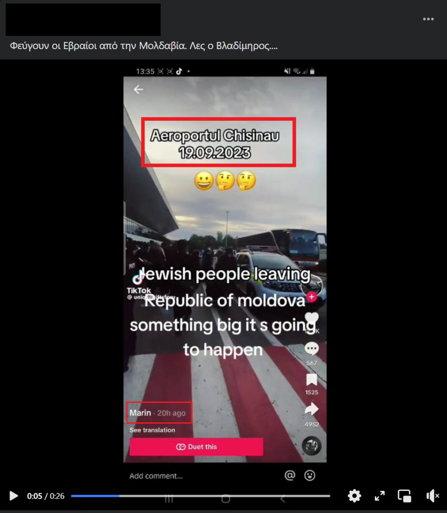 Από τις αναπαραγωγές που εντοπίσαμε στα μέσα κοινωνικής δικτύωσης εντοπίζονται διαφορετικές εκδόσεις στο κείμενο του βίντεο και σε μια από αυτές βλέπουμε την ημερομηνία 19-9-2023 δίπλα στο όνομα του αεροδρομίου “Chisinau”.