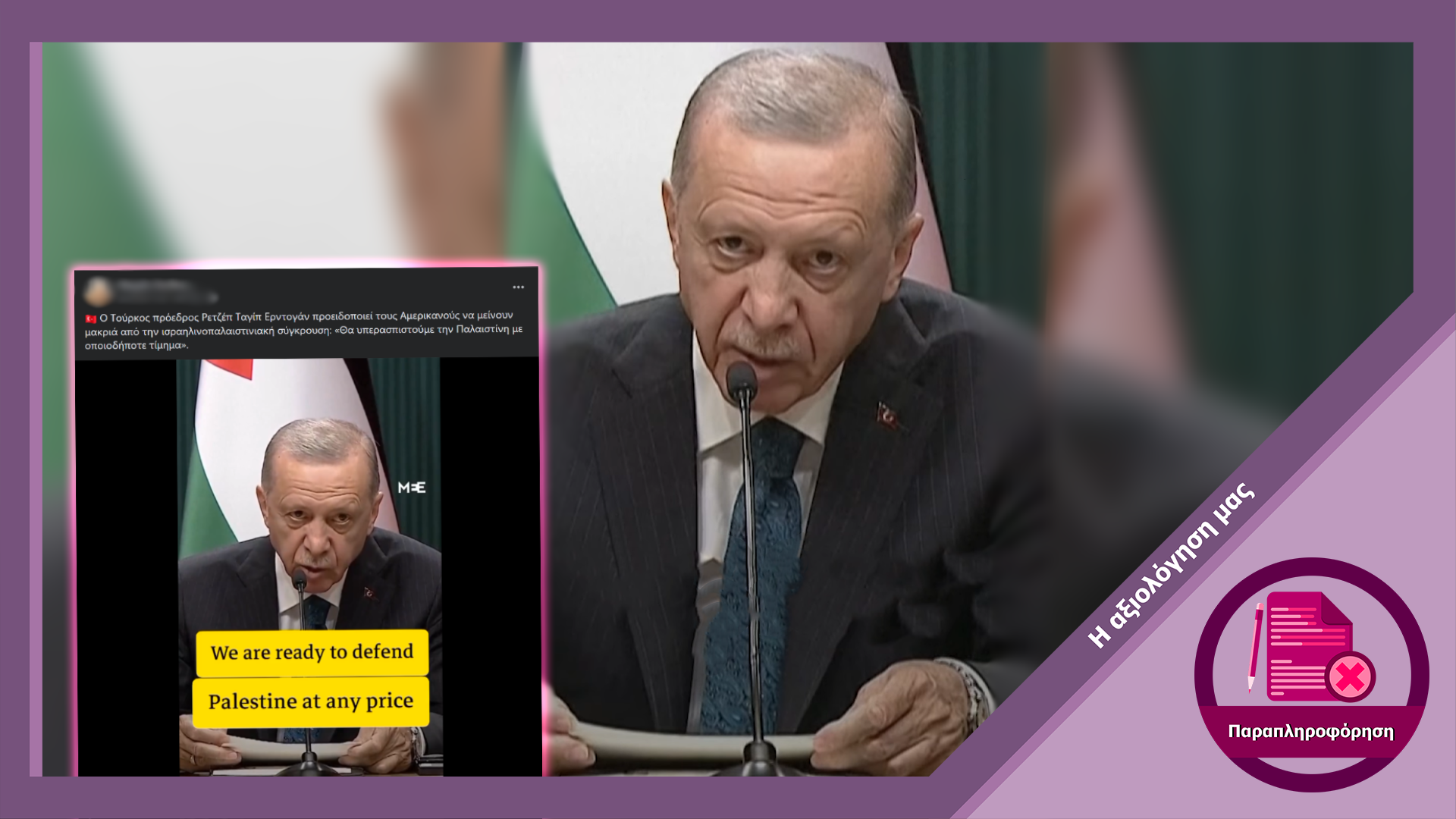 Το εξεταζόμενο βίντεο δείχνει ομιλία του Τούρκου Προέδρου, Ρετζέπ Ταγίπ Ερντογάν, στην οποία, σύμφωνα με τους ενσωματωμένους υπότιτλους, “προειδοποιεί τους Αμερικανούς να μείνουν μακριά από την ισραηλινοπαλαιστινιακή σύγκρουση” δηλώνοντας ότι “Θα υπερασπιστούμε την Παλαιστίνη με οποιοδήποτε τίμημα”.