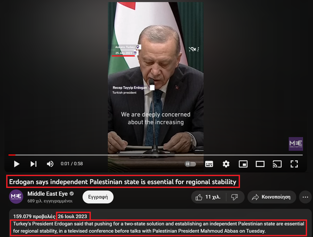 Παρότι πρόκειται για πραγματικό βίντεο, οι υπότιτλοι που έχουν ενσωματωθεί δεν είναι πραγματικοί. Το επίμαχο βίντεο προέρχεται από τηλεδιάσκεψη του Ρετζέπ Ταγίπ Ερντογάν πριν τη συνάντηση με τον Πρόεδρο της Παλαιστίνης, Μαχμούντ Αμπάς, η οποία έλαβε χώρα στις 25 Ιουλίου 2023. Στην εν λόγω τηλεδιάσκεψη ο Τούρκος πρόεδρος δήλωσε, μεταξύ άλλων, πως η εγκαθίδρυση ενός ανεξάρτητου Κράτους της Παλαιστίνης θα ήταν απαραίτητη για την σταθερότητα της περιοχής, υποστηρίζοντας έτσι τη λύση των δύο κρατών στο θέμα της σύγκρουσης μεταξύ Ισραήλ και Παλαιστίνης.