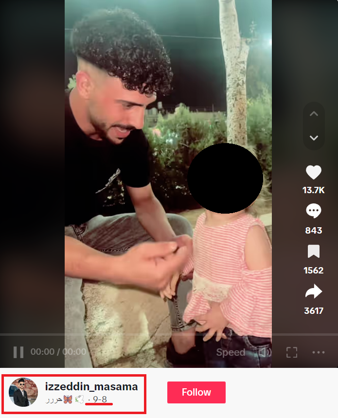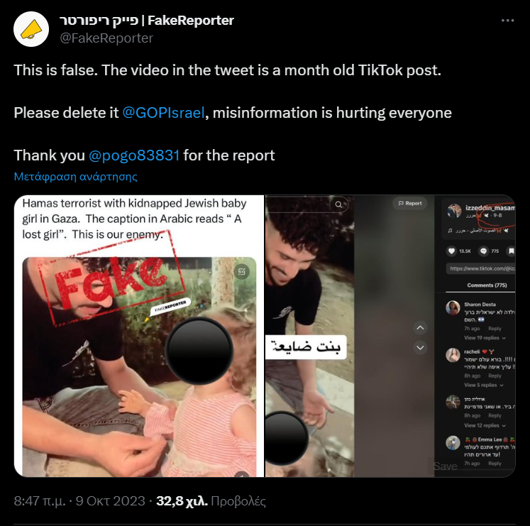 Σε λογαριασμούς στα social media κυκλοφόρησε βίντεο το οποίο, σύμφωνα με τις εξεταζόμενες αναρτήσεις, δείχνει μέλος της Χαμάς μαζί με ένα κοριτσάκι 2 χρονών, το οποίο έχει απαγάγει. Ωστόσο, ο εν λόγω ισχυρισμός είναι ψευδής, καθώς το επίμαχο βίντεο είχε αναρτηθεί από λογαριασμό στο TikTok από αρχές Σεπτεμβρίου του 2023, σχεδόν ένα μήνα πριν την πρόσφατη επίθεση της Χαμάς στο Ισραήλ.