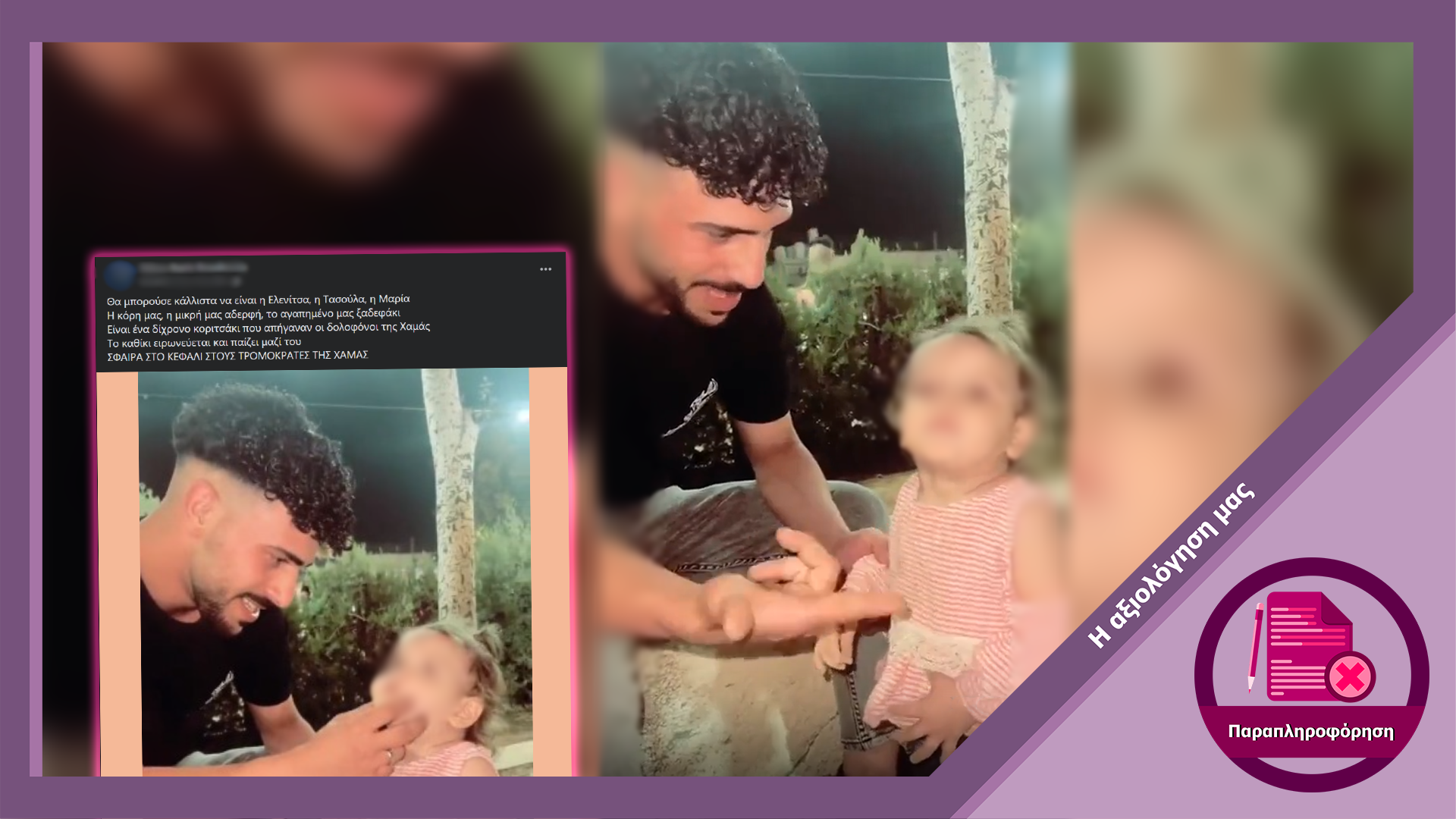 Σε λογαριασμούς στα social media κυκλοφόρησε βίντεο το οποίο, σύμφωνα με τις εξεταζόμενες αναρτήσεις, δείχνει μέλος της Χαμάς μαζί με ένα κοριτσάκι 2 χρονών, το οποίο έχει απαγάγει. Ωστόσο, ο εν λόγω ισχυρισμός είναι ψευδής, καθώς το επίμαχο βίντεο είχε αναρτηθεί από λογαριασμό στο TikTok από αρχές Σεπτεμβρίου του 2023, σχεδόν ένα μήνα πριν την πρόσφατη επίθεση της Χαμάς στο Ισραήλ.