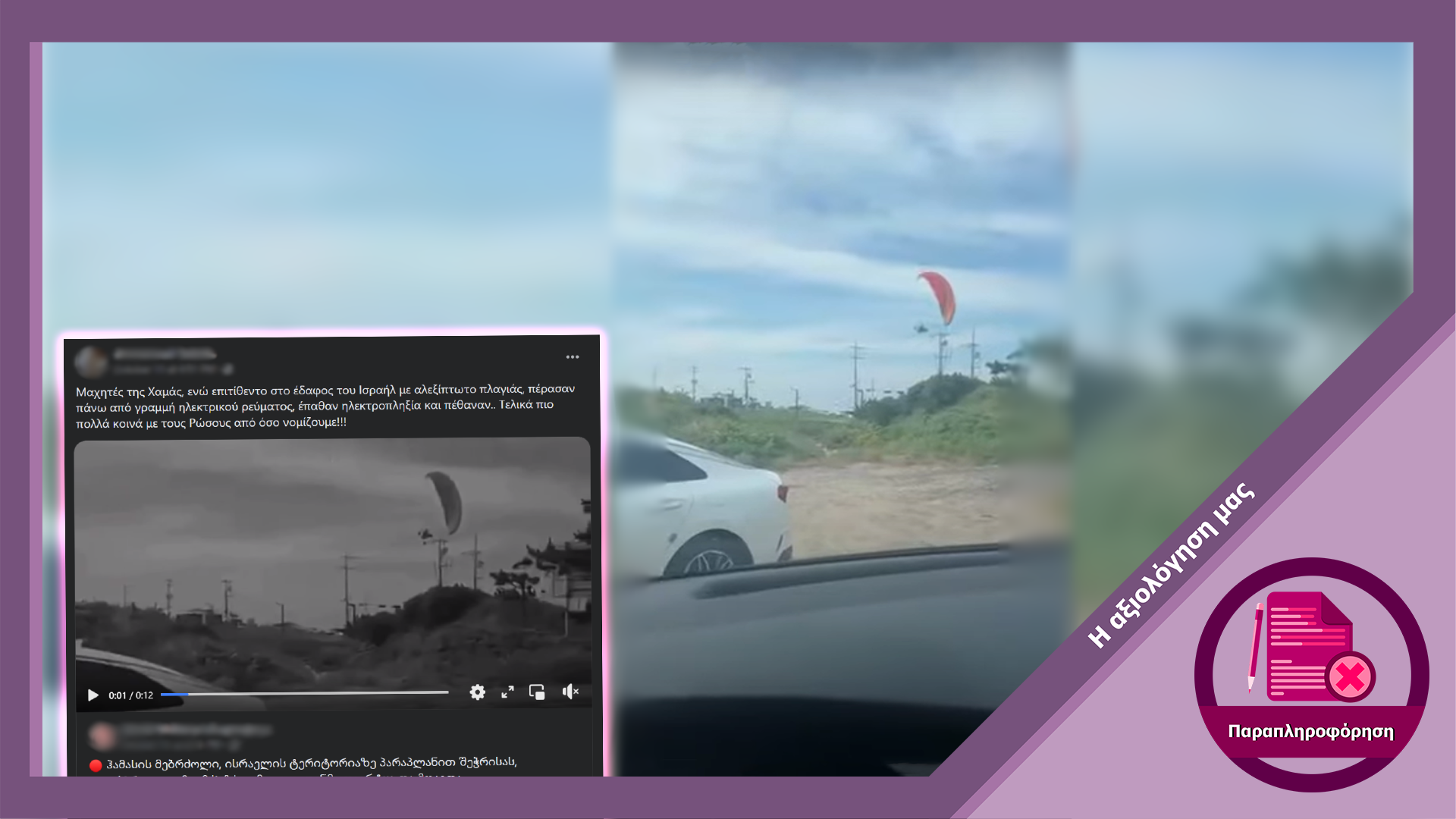 Σελίδες ενημέρωσης και λογαριασμοί στα social media αναπαράγουν ένα βίντεο το οποίο πλαισιώνεται με τον ισχυρισμό ότι απεικονίζει μέλος της Χαμάς, κατά την πρόσφατη επίθεση της παραστρατιωτικής οργάνωσης στο Ισραήλ, να πέφτει με αλεξίπτωτο πλαγιάς πάνω σε ηλεκτροφόρα καλώδια και να πιάνει φωτιά. Ωστόσο, το εν λόγω βίντεο είναι προγενέστερο της πρόσφατης επίθεσης στο Ισραήλ και λήφθηκε στη Νότια Κορέα.