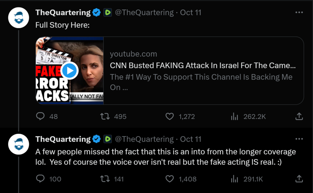 Οι οδηγίες που ακούγονται στο παραπάνω βίντεο είναι ηχητικό αρχείο που προστέθηκε με επεξεργασία στο αρχικό βίντεο στο πλαίσιο σάτιρας. Το βίντεο με τον τροποποιημένο ήχο ανέβασε αρχικά το κανάλι “TheQuartering” στο YouTube στις 10 Οκτωβρίου, κοινοποιώντας το στη συνέχεια στο X (πρώην Twitter). Το βίντεο στη συνέχεια κοινοποιήθηκε από πληθώρα λογαριασμών ως πραγματικό, παρότι ο λογαριασμός του “TheQuartering” παραδέχτηκε δημόσια ότι η εν λόγω έκδοση του βίντεο ήταν αποτέλεσμα επεξεργασίας.