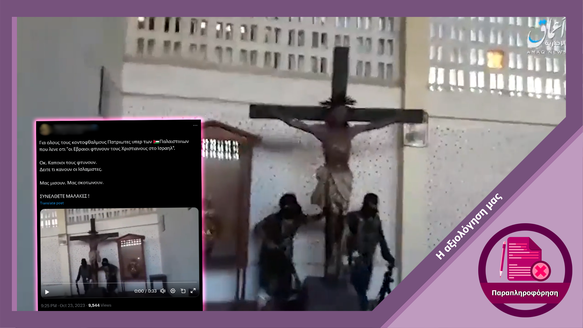 Στα μέσα κοινωνικής δικτύωσης κυκλοφορεί βίντεο το οποίο δείχνει μια ομάδα αντρών με όπλα και μάσκες να βανδαλίζουν χριστιανική εκκλησία. Οι αναρτήσεις παρουσιάζουν το βίντεο παραπλανητικά ως πρόσφατο και σχετικό με την σύγκρουση Χαμάς-Ισραήλ . Ωστόσο το βίντεο δείχνει επίθεση της ISIS στις Φιλιππίνες από το 2017.