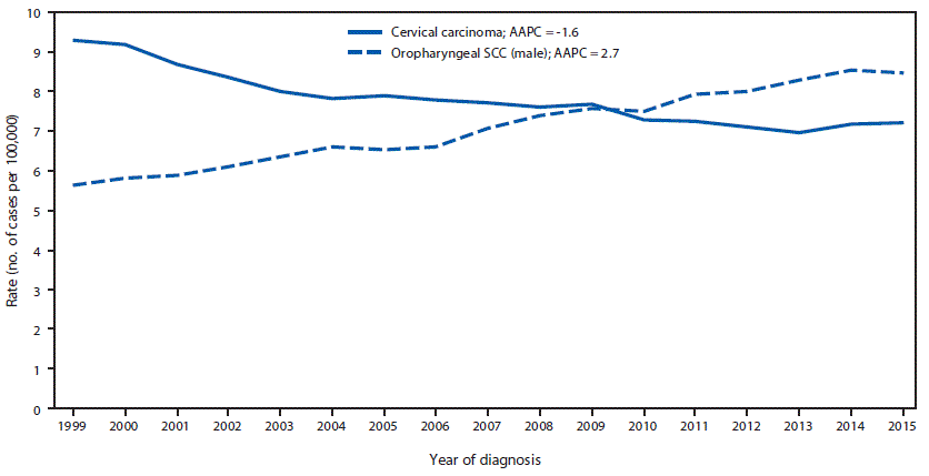 Οι μεταβολές της καταγεγραμμένης συχνότητας καρκίνων του τραχήλου της μήτρας και του οροφάρυγγα (λαιμού) στις ΗΠΑ μεταξύ 1999 και 2015.