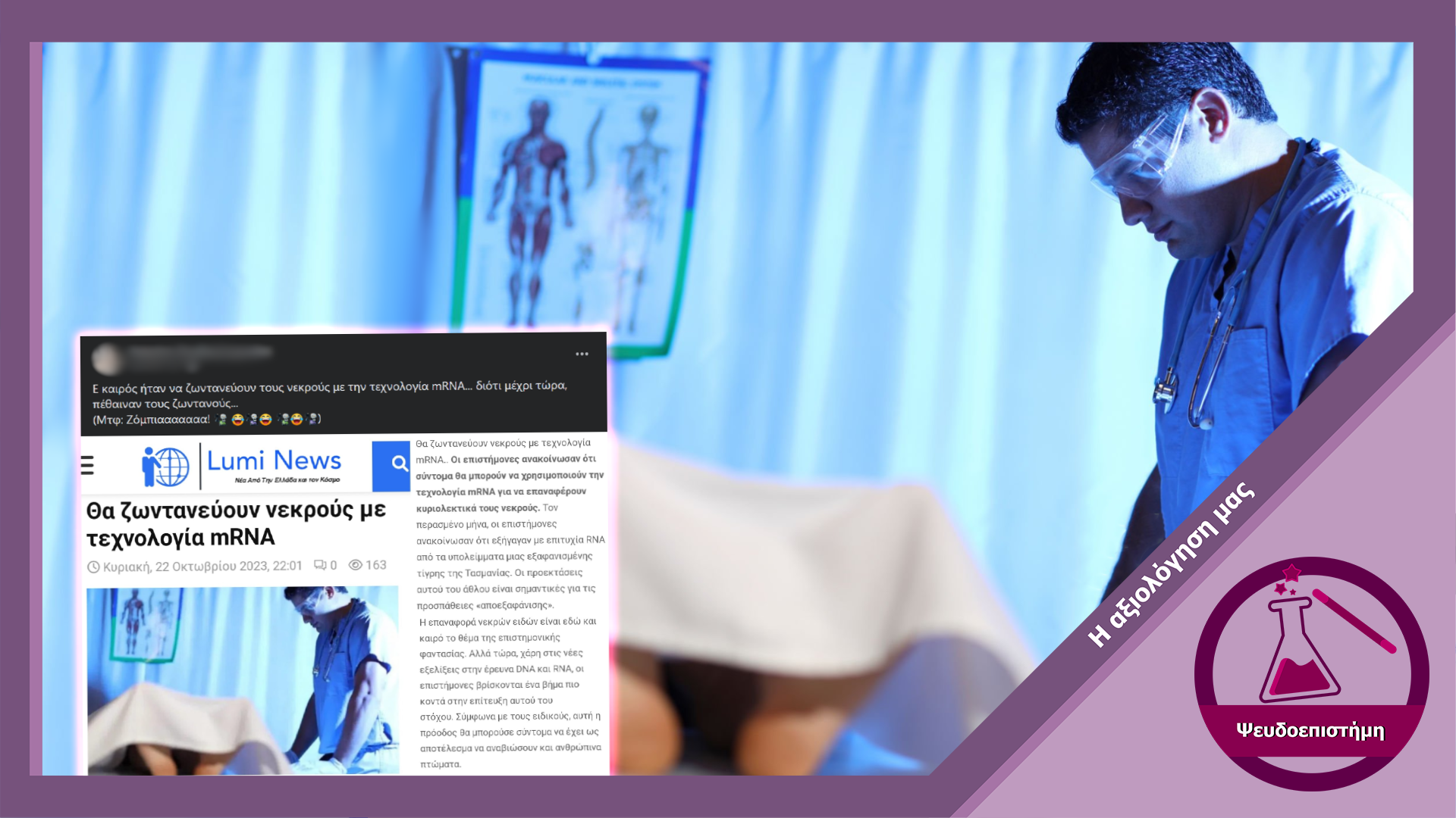 Δημοσιεύματα σε ιστολόγια και αναρτήσεις στα social media αναπαράγουν τον ισχυρισμό ότι ερευνητές ανακοίνωσαν πως σύντομα θα μπορούν να χρησιμοποιήσουν τεχνολογία mRNA για να επαναφέρουν νεκρούς στην ζωή. Ωστόσο ο εν λόγω ισχυρισμός συνιστά διαστρέβλωση αποτελεσμάτων σχετικών επιστημονικών μελετών.