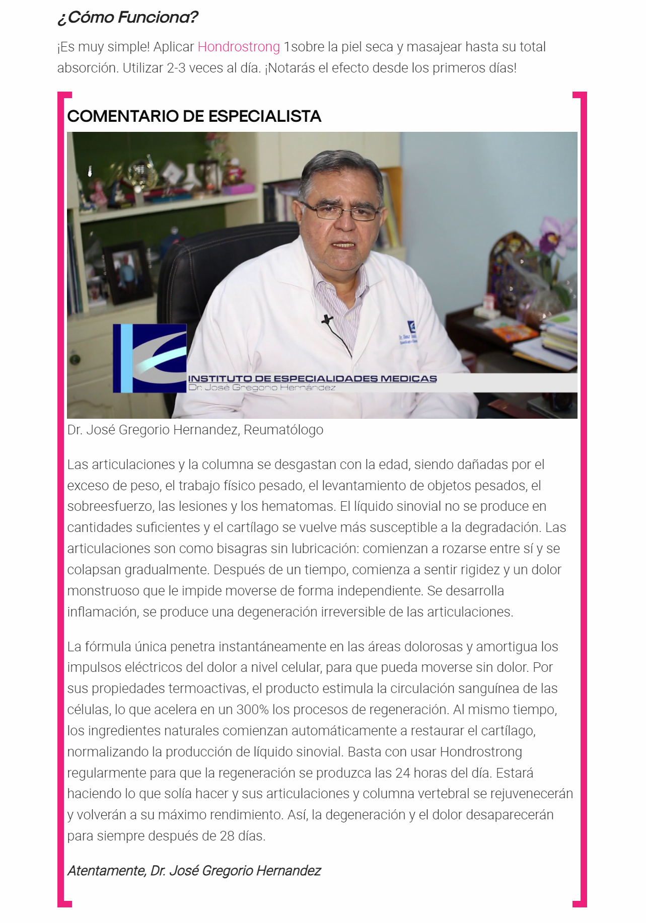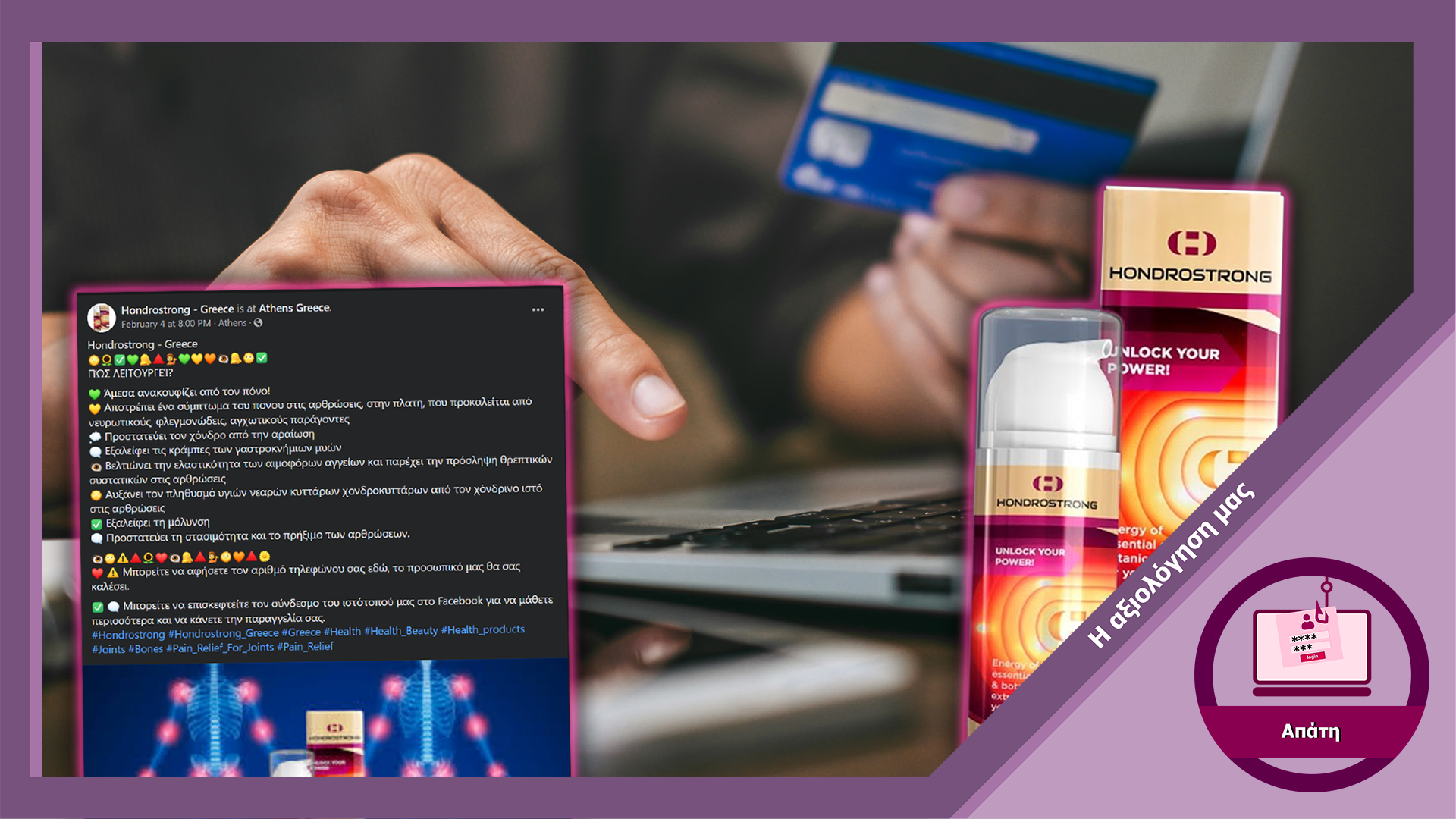 Σελίδες στα social media και ιστολόγια παρουσιάζουν το προϊόν “Hondrostrong” ως φαρμακευτικό σκεύασμα για την καταπολέμηση της αρθρίτιδας. Οι εν λόγω σελίδες παρουσιάζουν δηλώσεις οι οποίες υποτίθεται πως έχουν γίνει από γνωστούς γιατρούς για να ενισχύσουν την αξιοπιστία των λεγομένων τους. Ωστόσο, οι εν λόγω αναφορές δεν έχουν καμία επιστημονική βάση, ενώ το σκεύασμα που διαφημίζεται δεν έχει εγκριθεί από τον ΕΟΦ.