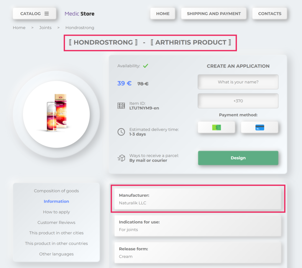 Παλαιότερα ωστόσο, το σκεύασμα Hondrostrong είχε εμφανιστεί και με ετικέτες άλλων διακινητών όπως η εταιρεία “Shopping Service” η οποία ήταν καταχωρημένη στην Λετονία από το 2015 και αφαιρέθηκε από το μητρώο επιχειρήσεων της χώρας το 2020 μετά από καταδικαστική απόφαση για παραβίαση της Ευρωπαϊκής νομοθεσίας σχετικά με την προστασία προσωπικών δεδομένων.
