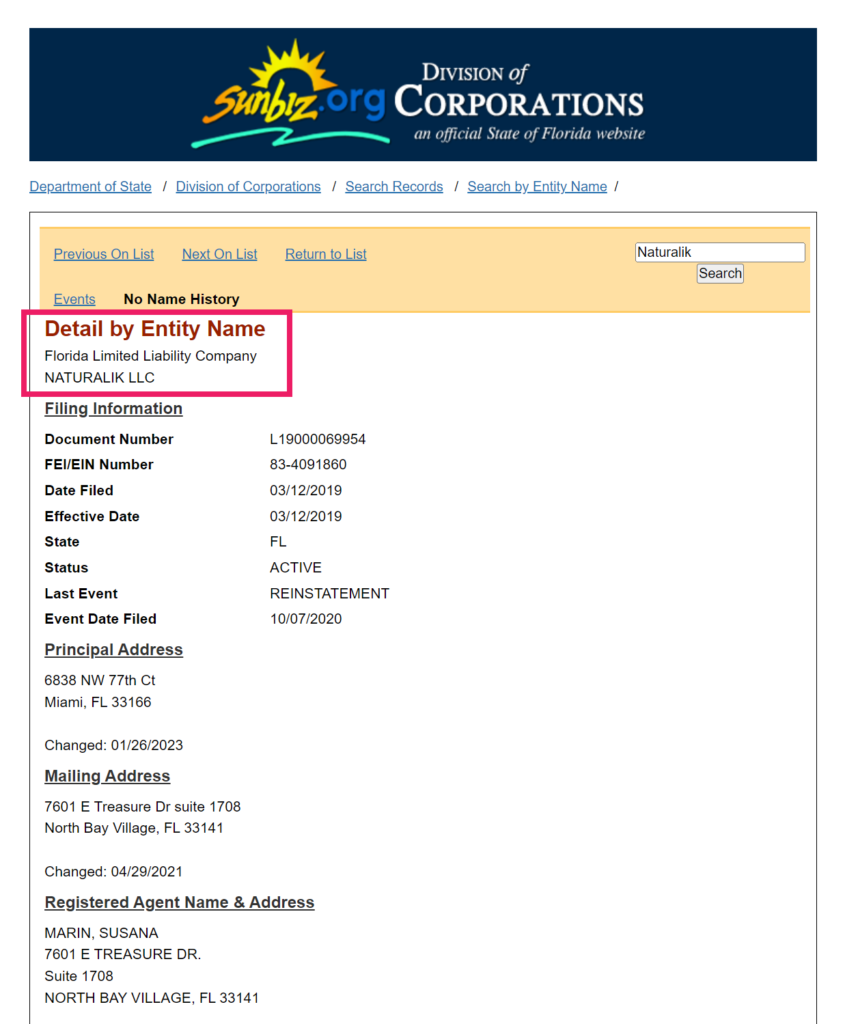 Σε άλλα καταστήματα εντοπίζουμε ως κατασκευαστή την εταιρία Naturalik LLC, η οποία είναι καταχωρημένη στη Φλόριντα των ΗΠΑ.