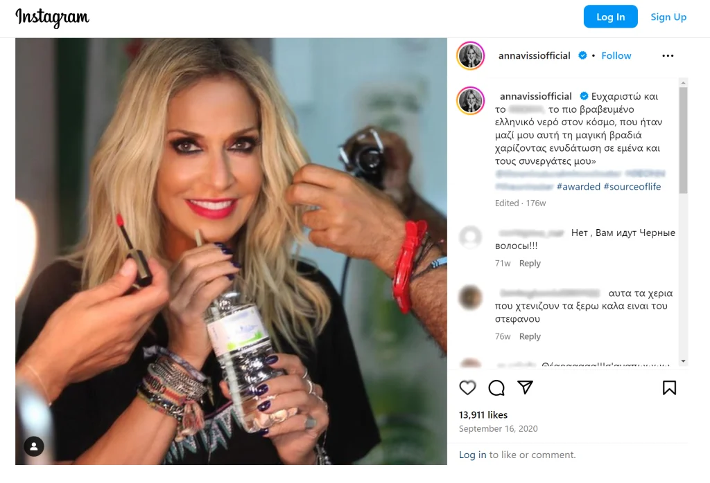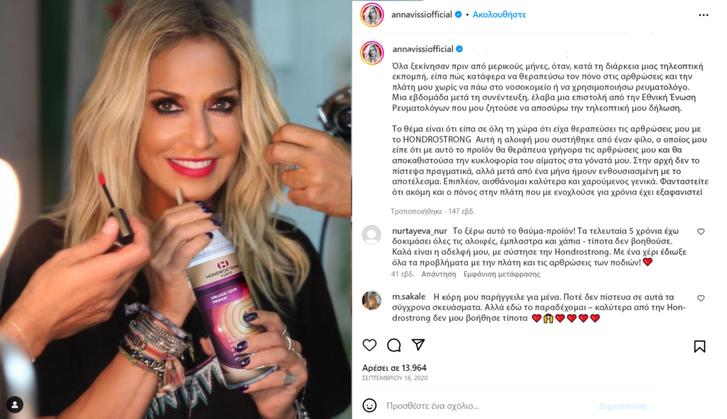 Πέραν των δηλώσεων από ειδικούς γιατρούς, αυτά τα δημοσιεύματα παραθέτουν και ψευδείς δηλώσεις υποστήριξης από δημόσια πρόσωπα. Σε ένα από τα επίμαχα άρθρα, όπου εμφανίζεται και το όνομα του κ. Μπαραλιάκου, εμφανίζεται η τραγουδίστρια Άννα Βίσσυ ως “θύμα” της Ελληνικής Ρευματολογικής Εταιρείας η οποία, σύμφωνα με το δημοσίευμα, την απείλησε επειδή η ίδια μίλησε για τις “θαυματουργές” ιδιότητες του προϊόντος Hondrostrong. Ωστόσο, αυτές οι δηλώσεις είναι ψευδείς, καθώς δεν υπάρχει καμία άλλη αναφορά σε έγκριτο δημοσιογραφικό μέσο στην Άννα Βίσσυ και στο Hondrostrong με οποιονδήποτε τρόπο. Επίσης, εντός του άρθρου παρατίθεται στιγμιότυπο οθόνης από ανάρτηση της τραγουδίστριας στο Instagram στην οποία φαίνεται να προωθεί δημόσια το Hondrostrong. Ωστόσο, κάνοντας αναζήτηση στις αναρτήσεις του επίσημου προφίλ της Άννας Βίσσυ στο Instagram εντοπίσαμε την επίμαχη ανάρτηση η οποία είναι διαφήμιση για συγκεκριμένο προϊόν εμφιαλωμένου νερού. Επομένως, το επίμαχο δημοσίευμα χρησιμοποίησε την αρχική ανάρτηση αλλάζοντας το κείμενο.