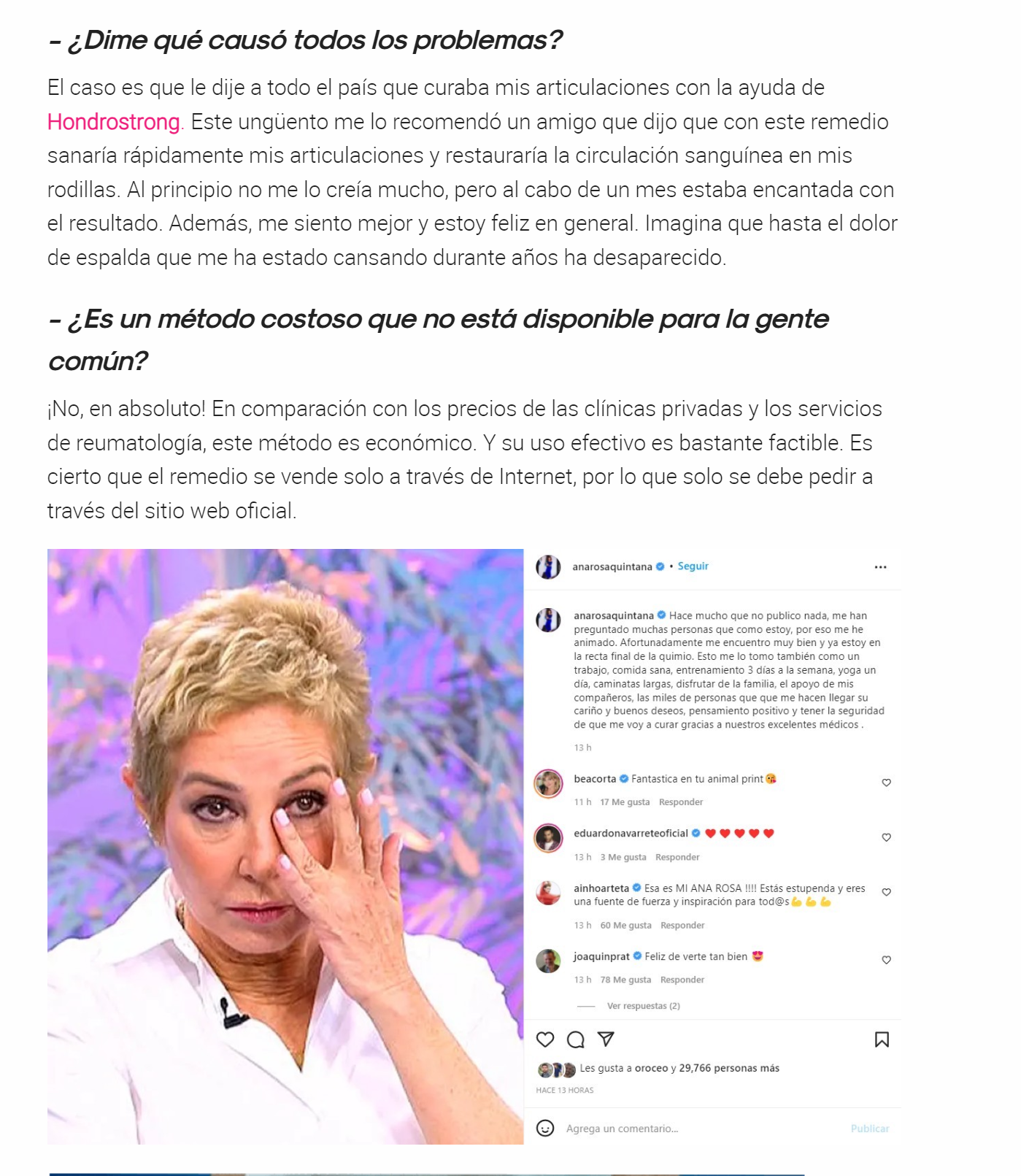 Μέσω αντίστροφης αναζήτησης εικόνας εντοπίσαμε ισπανικό άρθρο προώθησης του Hondrostrong το οποίο έχει την ίδια δομή με το ελληνικό άρθρο, ενώ η μορφή της σελίδας αντιγράφει το ισπανικό μέσo ενημέρωσης Lecturas. Όπως βλέπουμε από τα παρακάτω στιγμιότυπα, στην ισπανική έκδοση του άρθρου την θέση της Άννας Βίσσυ έχει η Ana Rosa Quintana, ισπανή δημοσιογράφος και παρουσιάστρια τηλεοπτικών εκπομπών η οποία παρουσιάζεται ως το διάσημο πρόσωπο που δέχθηκε απειλές από την αντίστοιχη Ρευματολογική Εταιρεία της Ισπανίας επειδή προώθησε το Hondrostrong.