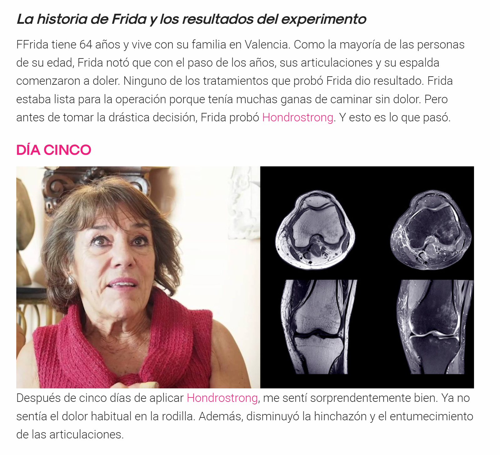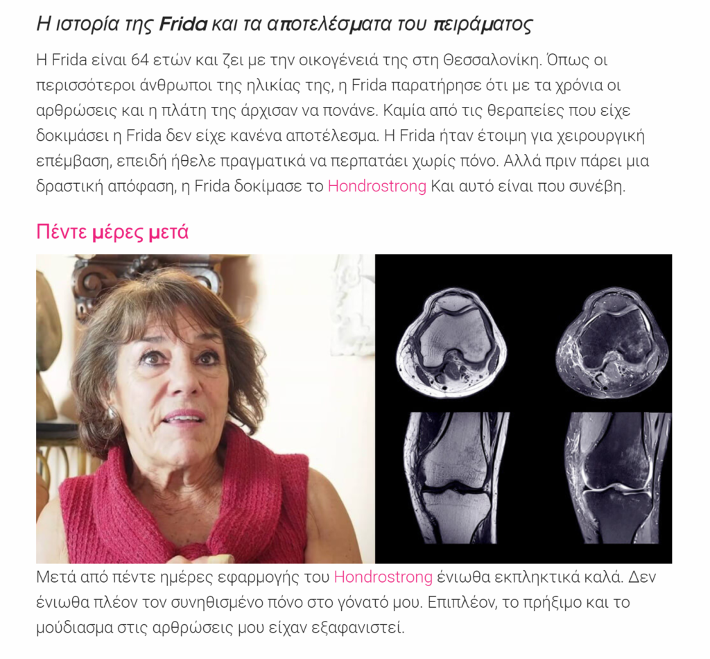 Τα εν λόγω δημοσιεύματα παραθέτουν επίσης “μαρτυρίες” από ανθρώπους που υποτίθεται πως δοκίμασαν το Hondrostrong και θεραπεύτηκαν από την πάθησή τους. Στο ίδιο άρθρο βλέπουμε τη “μαρτυρία” της “Frida” από τη Θεσσαλονίκη η οποία, όπως αναφέρει το άρθρο, θεραπεύτηκε από τα προβλήματα με τις αρθρώσεις της χρησιμοποιώντας το Hondrostrong.