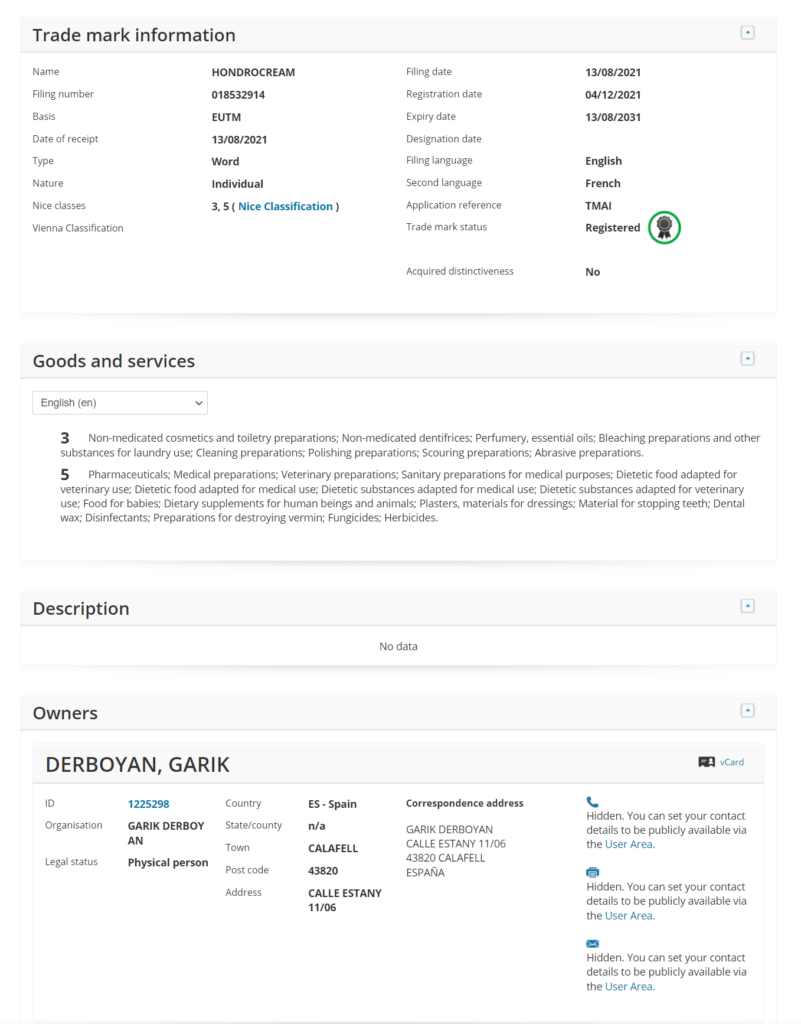 Το εξεταζόμενο σκεύασμα και παραλλαγές του διακινούνται σε διαδικτυακά καταστήματα στην Ελλάδα ήδη από το 2017, και πωλείται σε διάφορες χώρες εντός και εκτός Ευρωπαϊκής Ένωσης. Συγκεκριμένα, το 2017 κυκλοφορούσε στην Ελλάδα σκεύασμα με την ονομασία “Hondrocream” το οποίο παρουσιαζόταν ως αγωγή για ρευματικές παθήσεις. Το εν λόγω προϊόν εμφανίζεται καταχωρημένο από το 2022 στην σελίδα της υπηρεσίας πνευματικής ιδιοκτησίας της Ευρωπαϊκής Ένωσης (European Union Intellectual Property Office) στον “GARIK DERBOYAN” ο οποίος εμφανίζεται ως φυσικό πρόσωπο.