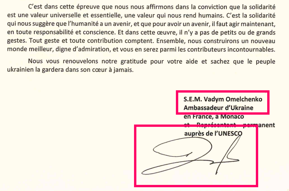 Αρχικά, η επιστολή που παρουσιάζεται στα εν λόγω δημοσιεύματα εμφανίζει προβλήματα καθώς, πέραν του ότι δεν βρίσκεται σε κανένα επίσημο λογαριασμό εκτός από τα δημοσιεύματα που αναπαράγουν το επίμαχο βίντεο, η υπογραφή του Vadym Omelchenko, του Ουκρανού πρέσβη στην Γαλλία ο οποίος υποτίθεται πως υπέγραψε την επιστολή, δεν είναι σωστή. Σε δυο προηγούμενες υπογεγραμμένες επιστολές του, οι οποίες τεκμηριώνονται από ανάρτηση τους σε επίσημους λογαριασμούς, βλέπουμε ότι η υπογραφή δεν ταιριάζει με αυτή που φαίνεται στην επιστολή του εξεταζόμενου βίντεο.