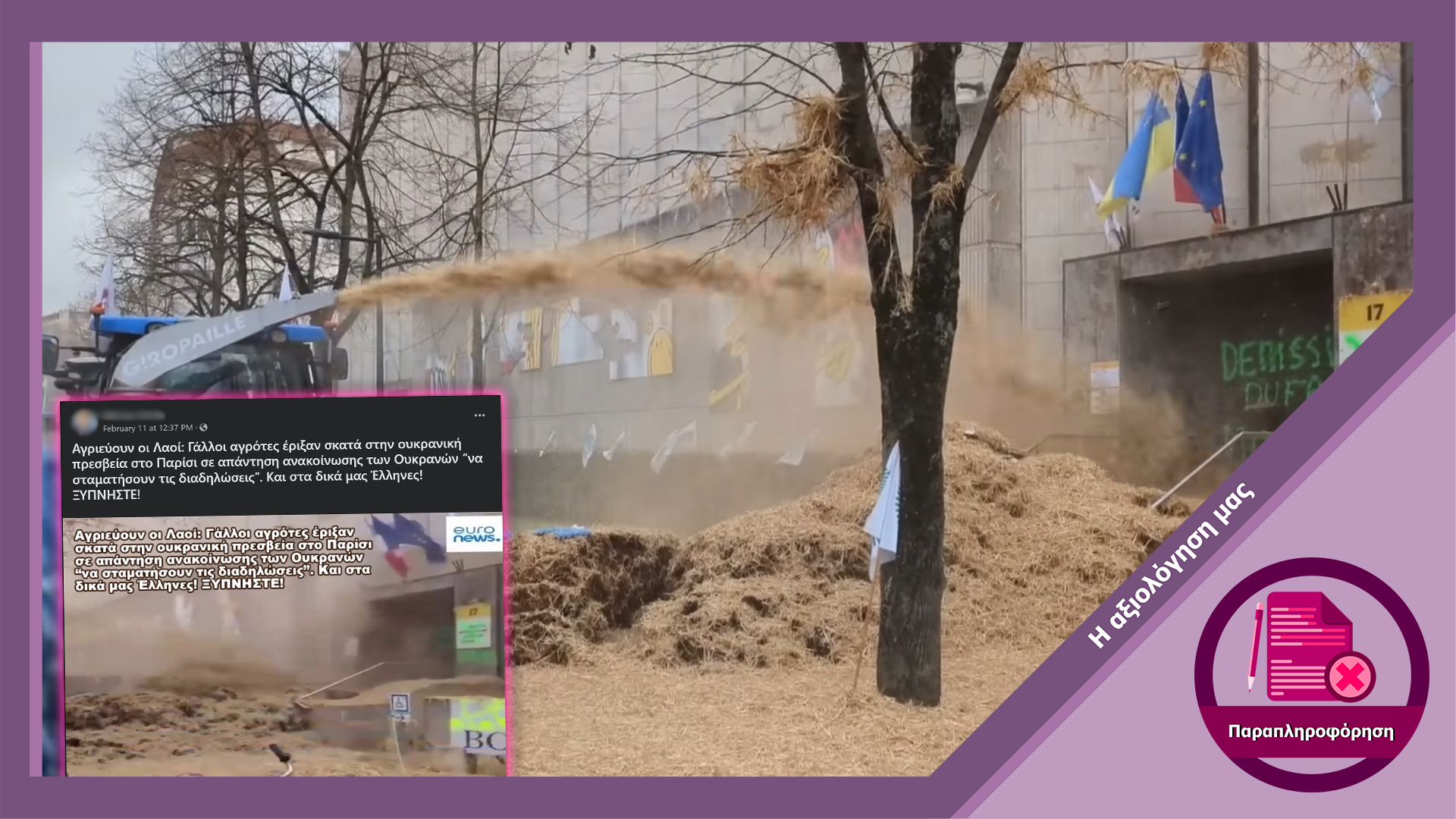 Σε μέσα ενημέρωσης και λογαριασμούς στα social media κυκλοφόρησε βίντεο συνοδευόμενο από τον ισχυρισμό ότι δείχνει Γάλλους αγρότες να ρίχνουν κοπριά στην είσοδο της ουκρανικής πρεσβείας στην Γαλλία. Ωστόσο, ο εν λόγω ισχυρισμός είναι ψευδής.