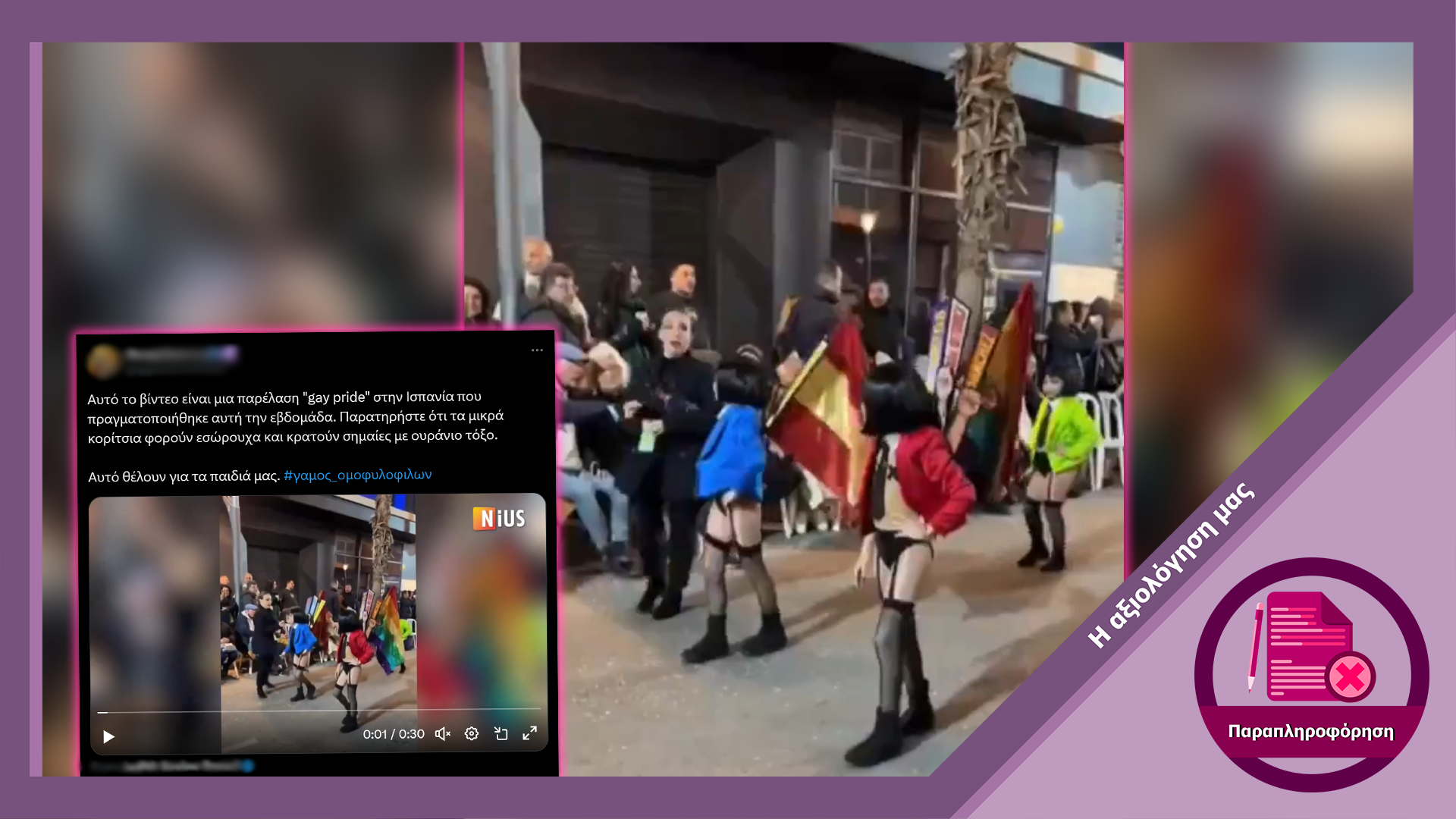 Το επίμαχο βίντεο δεν δείχνει παιδιά σε παρέλαση εκδήλωσης Pride στην Ισπανία, αλλά παράσταση θιάσου στο πλαίσιο καρναβαλιού. Η συγκεκριμένη παράσταση με τον τίτλο “Υποσχέσου μέχρι να εκλεγείς” είχε, μεταξύ άλλων, και πολιτικό χαρακτήρα καθώς τα κοστούμια των παιδιών είχαν πάνω τους κάρτες με ονόματα πολιτικών από όλο το πολιτικό φάσμα και τις θέσεις τους για ζητήματα έμφυλης ταυτότητας. Όπως τόνισε τόσο ο θίασος όσο και ο δήμαρχος της πόλης, κανένας εκ των συντελεστών ή των γονέων δεν είχαν καμία πρόθεση σεξουαλικοποίησης των παιδιών αλλά άσκησης κριτικής στην πολιτική και κοινωνική κατάσταση στην Ισπανία.