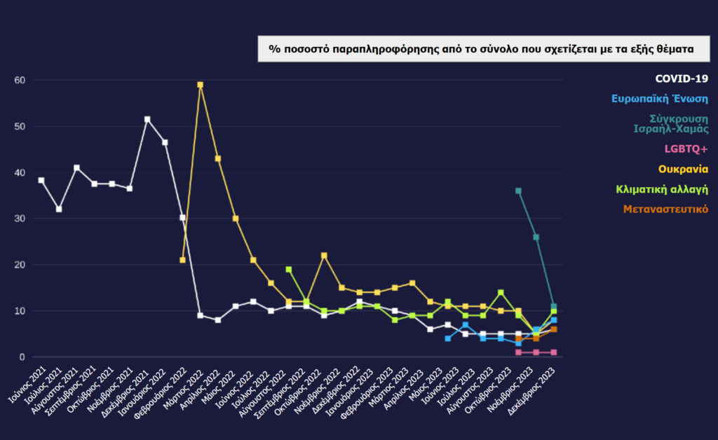 Το ποσοστό της παραπληροφόρησης σχετικά με την κρίση στην Μέση Ανατολή μειώνεται σημαντικά για δεύτερο συνεχόμενο μήνα. Το ποσοστό έπεσε από 36% τον Οκτώβριο, σε 24% τον Νοέμβριο και 11% τον Δεκέμβριο, πιθανότατα ως αποτέλεσμα της μεγάλης έκθεσης του κοινού στο θέμα μέσω των ΜΜΕ η οποία οδήγησε σε “κανονικοποίηση” της κατάστασης από την οπτική των πολιτών. Η παραπληροφόρηση σχετικά με την κλιματική αλλαγή διπλασιάστηκε από τον προηγούμενο μήνα, από 5% τον Νοέμβριο σε 10% τον Δεκέμβριο. Το ίδιο συνέβη, σε εύρος 2 μηνών σε αυτή την περίπτωση, και για την παραπληροφόρηση που αφορά την Ευρωπαϊκή Ένωση, η οποία αυξήθηκε από το 4% τον Οκτώβριο σε 8% τον Δεκέμβριο. Η παραπληροφόρηση για τον πόλεμο στην Ουκρανία και το μεταναστευτικό αυξήθηκε κατά μερικές μονάδες. Τα ποσοστά παραπληροφόρησης σε άλλα θέματα τα οποία παρακολουθούνται από το EDMO παρέμειναν σχετικά σταθερά.