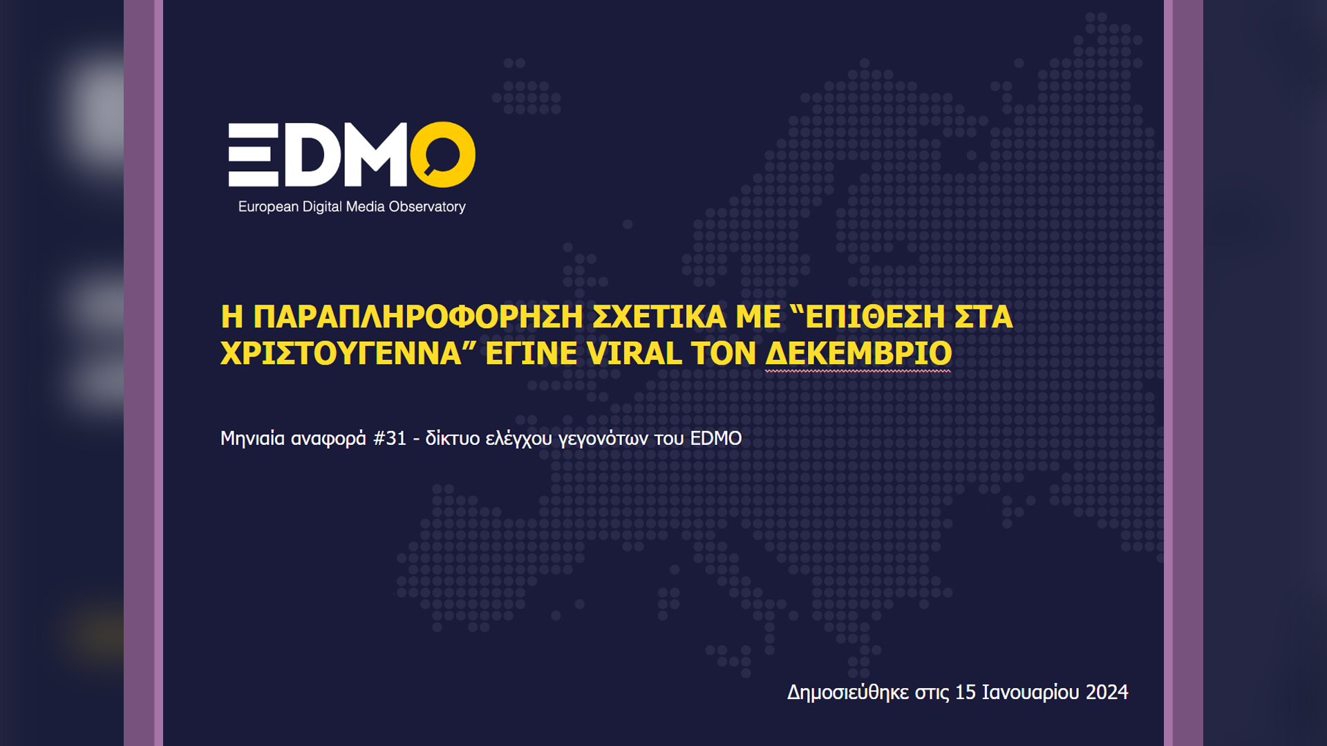 Για την 31η αναφορά του EDMO χρησιμοποιήθηκαν 1,416 άρθρα fact-checking από 34 Οργανισμούς και η περίοδος που καλύπτουν είναι 1-31 Δεκεμβρίου.Οι οργανισμοί που συμμετείχαν στην 31η αναφορά: 15Min, AFP, Correctiv, Delfi, Demagog.cz, Demagog.pl, Demagog.sk, DPA, Eesti Päevaleht, EFE Verifica, Ellinika Hoaxes, Eurocomunicare, Fact Check Cyprus, Factcheck Vlaanderen, FactReview, Faktisk, FranceTV, Funky, Greece Fact Checking, Källkritikbyrån, Knack, Lakmusz, Maldita, Medizin transparent, Newtral, Nieuwscheckers, Oštro, PagellaPolitica/Facta, Polígrafo, Re:Baltica, The Journal Fact-Check, TjekDet, Verifica RTVE, Verificat Θα βρείτε ολόκληρη την 31η αναφορά του EDMO στα αγγλικά εδώ και στα ελληνικά εδώ.