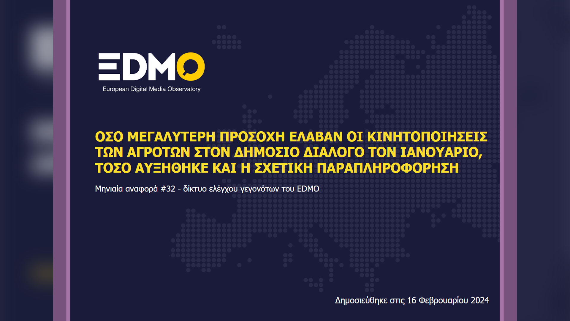 Για την 32η αναφορά του EDMO χρησιμοποιήθηκαν 1,490 άρθρα fact-checking από 34 Οργανισμούς και η περίοδος που καλύπτουν είναι 1-31 Ιανουαρίου.Οι οργανισμοί που συμμετείχαν στην 32η αναφορά: AFP, Correctiv, Check4facts, Delfi, Demagog.cz, Demagog.pl, DPA, DW, Eesti Päevaleht, EFE Verifica, Ellinika Hoaxes, Eurocomunicare, Fact Check Cyprus, Factcheck Vlaanderen, FactReview, Faktabaari, Faktisk, Funky, Greece Fact Check, Källkritikbyrån, Knack, Lakmusz, Maldita, Medizin transparent, Newtral, Oštro, PagellaPolitica/Facta, Polígrafo, Pravda, Re:Baltica, The Journal Fact-Check, TjekDet, Verifica RTVE, Verificat Θα βρείτε ολόκληρη την 32η αναφορά του EDMO στα αγγλικά εδώ και στα ελληνικά εδώ.