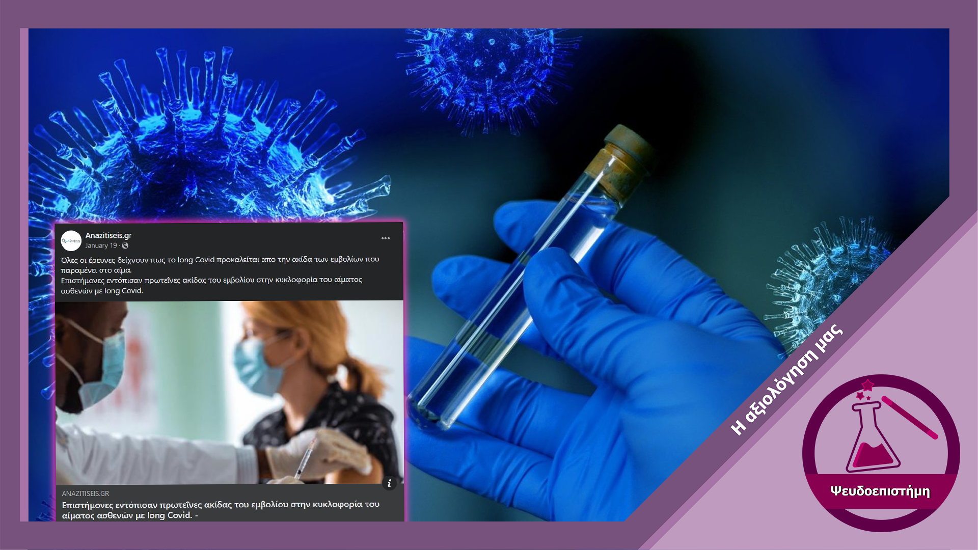 Δημοσιεύματα σε ιστολόγια και αναρτήσεις στα μέσα κοινωνικής δικτύωσης αναπαράγουν τον ισχυρισμό ότι επιστημονικές μελέτες εντόπισαν δείγματα από πρωτεΐνη-ακίδα η οποία παράγεται από τα εμβόλια της COVID-19 στο αίμα ασθενών με long COVID. Ωστόσο, ο εν λόγω ισχυρισμός είναι παραπλανητικός καθώς η μελέτη που χρησιμοποιείται ως απόδειξη του ισχυρισμού έχει σημαντικά μεθοδολογικά σφάλματα.