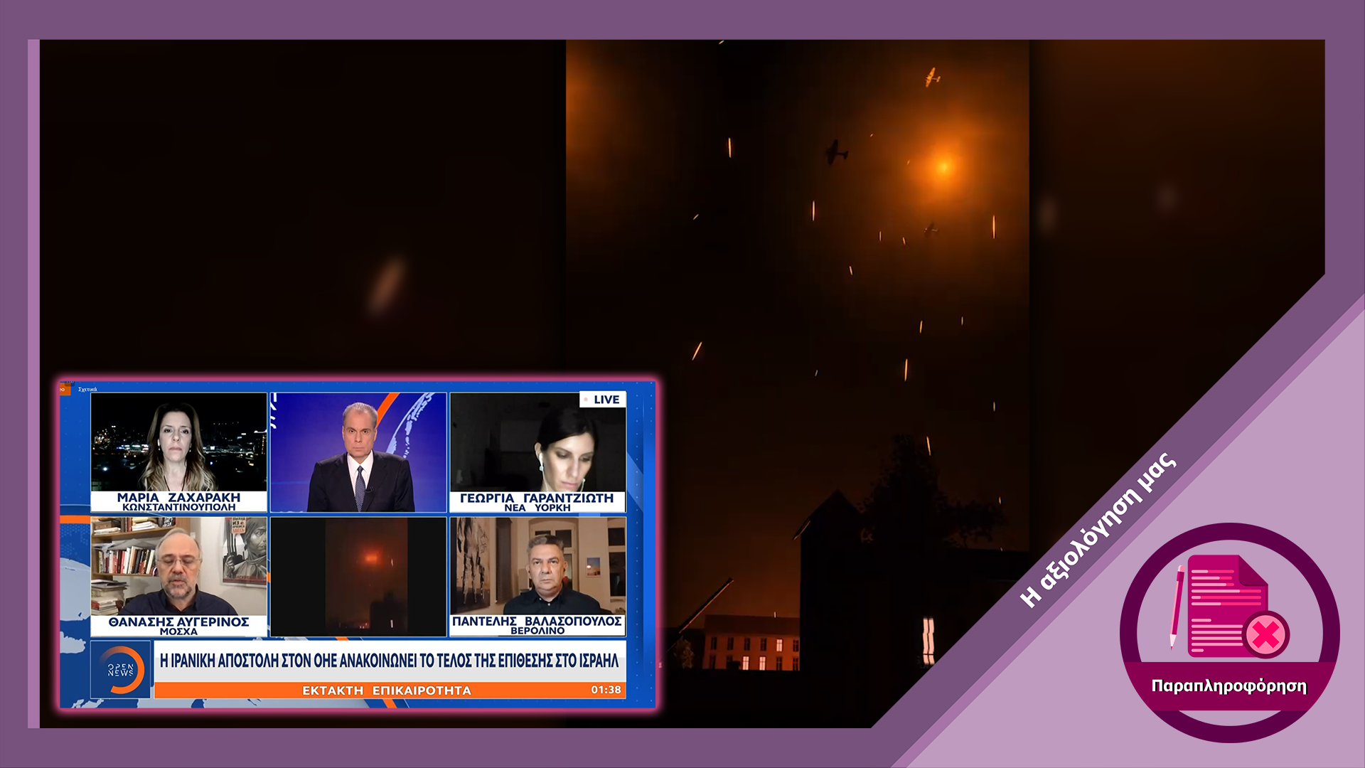 Το βίντεο που παρουσιάστηκε από αναρτήσεις στα social media και από δελτίο ειδήσεων στις 14 Απριλίου 2024 ως πλάνα από την επίθεση του Ιράν στο Ισραήλ είναι στην πραγματικότητα βίντεο 3D animation το οποίο δημοσιεύθηκε αρχικά το 2021. Το ίδιο βίντεο έχει χρησιμοποιηθεί ξανά το 2022 στο πλαίσιο παραπληροφόρησης αναφορικά με την επίθεση της Ρωσίας στην Ουκρανία.