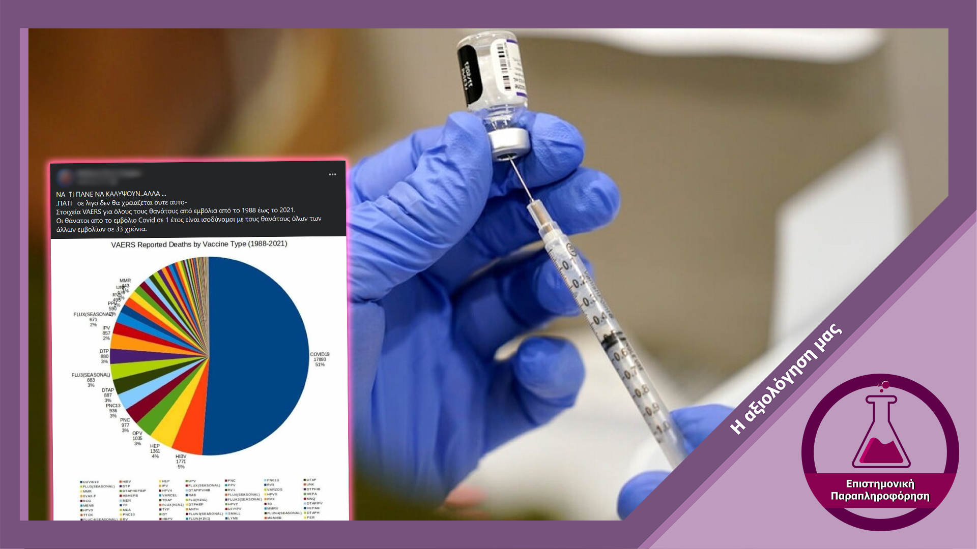 Στα μέσα κοινωνικής δικτύωσης αναπαράγεται γράφημα το οποίο υποτίθεται πως δείχνει θανάτους οι οποίοι προκλήθηκαν από εμβόλια της COVID-19. Ωστόσο ο εν λόγω ισχυρισμός συνιστά διαστρέβλωση των πραγματικών δεδομένων, καθώς πρόκειται για αναφορές θανάτων όχι απαραίτητα θανάτους που αποδόθηκαν αιτιωδώς στα εμβόλια της COVID-19.
