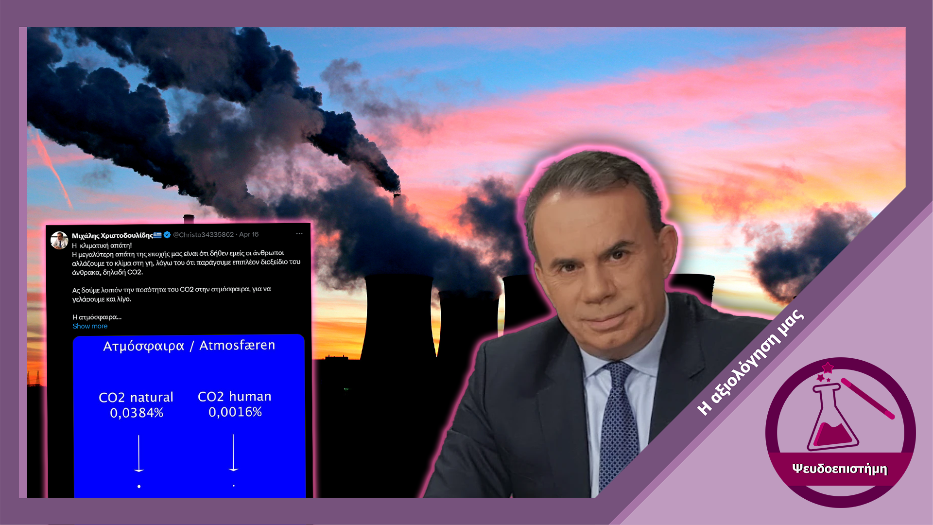 Σε ανάρτηση που κοινοποίησε ο Μιχάλης Χριστοδουλίδης, τομεάρχης ενέργειας περιβάλλοντος και υποδομών της Ελληνικής Λύσης στο X, διατυπώνεται ο ισχυρισμός ότι η ανθρωπογενής κλιματικής αλλαγή αποτελεί απάτη. Σύμφωνα με τον κ. Χριστοδουλίδη η φυσική συγκέντρωση διοξειδίου του άνθρακα στην ατμόσφαιρα είναι σημαντικά μεγαλύτερη από το διοξείδιο που προέρχεται από ανθρωπογενείς δραστηριότητες, γεγονός που αποδεικνύει ότι η αποσταθεροποίηση του κλίματος δεν έχει ανθρωπογενή αίτια. Ωστόσο, ενώ ισχύει ότι η φυσική συγκέντρωση CO2 στην ατμόσφαιρα είναι μεγαλύτερη από την συγκέντρωση του αερίου που προέρχεται από τις ανθρώπινες δραστηριότητες, αυτό δεν σημαίνει ότι η αποσταθεροποίηση του κλίματος που βιώνουμε είναι αποτέλεσμα φυσικών διεργασιών.