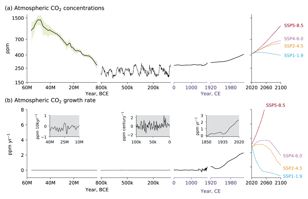 Μάλιστα, σύμφωνα με τα στοιχεία της τελευταίας αναφοράς από την IPCC, ακολουθώντας τα σημερινά μέτρα κατά της κλιματικής αλλαγής το ποσοστό στο CO2 από ανθρωπογενείς πηγές αναμένεται να ξεπεράσει το ποσοστό του φυσικού CO2 μέσα σε λίγες δεκαετίες (>560 ppm).