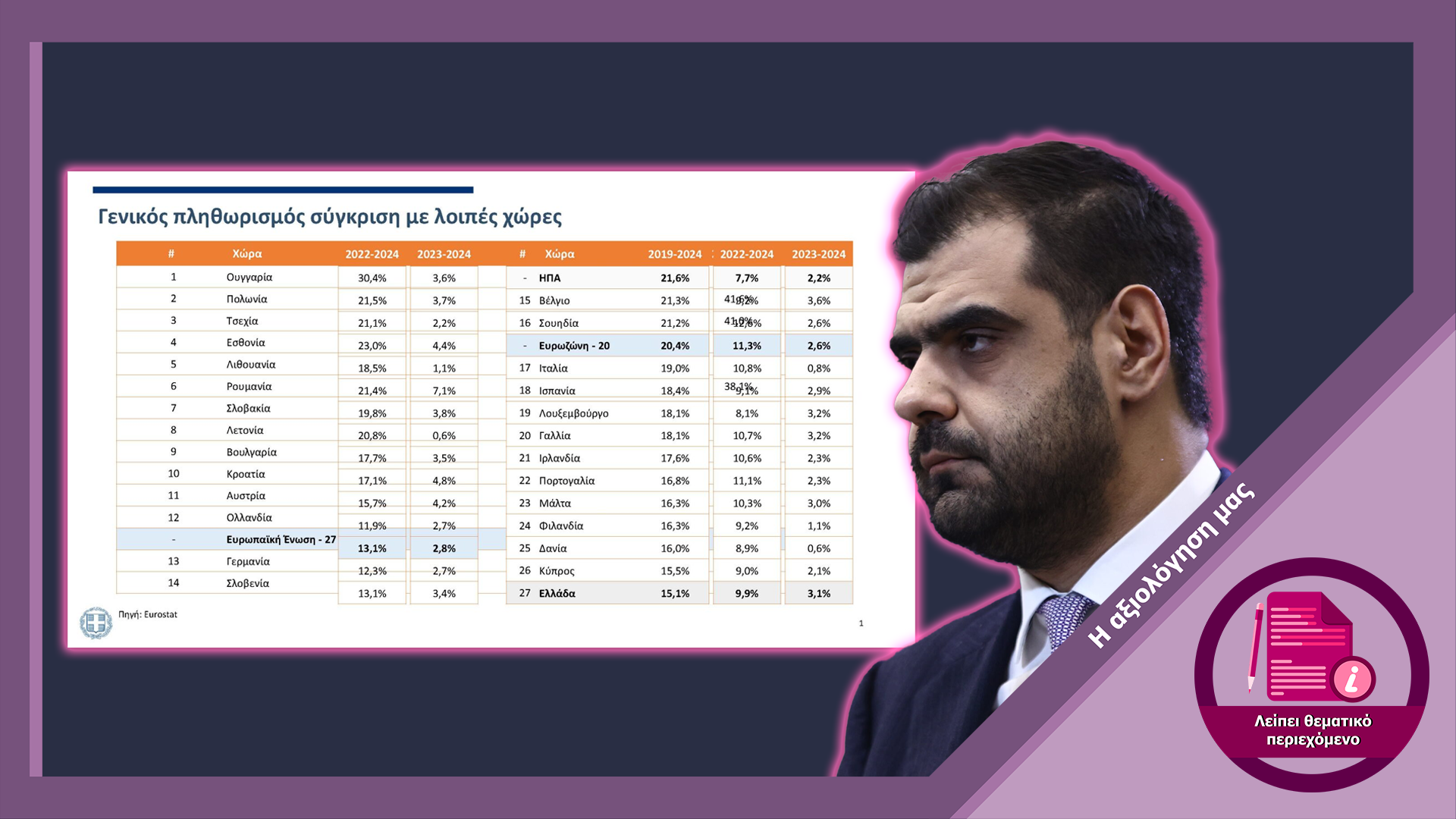 Στις 21/5/2024, ο κυβερνητικός εκπρόσωπος Παύλος Μαρινάκης, προέβη σε παράθεση δεδομένων σύγκρισης του πληθωρισμού μεταξύ της Ελλάδας και των χωρών της Ευρωπαϊκής Ένωσης. Ωστόσο, όπως θα δούμε, τα δεδομένα αφορούσαν ανομοιογενείς συγκρίσεις και χρειάζονταν διευκρινήσεις ώστε να γίνουν ορθώς κατανοητά. Επίσης, ενώ ο κ. Μαρινάκης έκανε λόγο για συνολική αύξηση των πραγματικών μισθών, αυτό αμφισβητείται στα δεδομένα της Ελληνικής Στατιστικής Αρχής (ΕΛΣΤΑΤ).