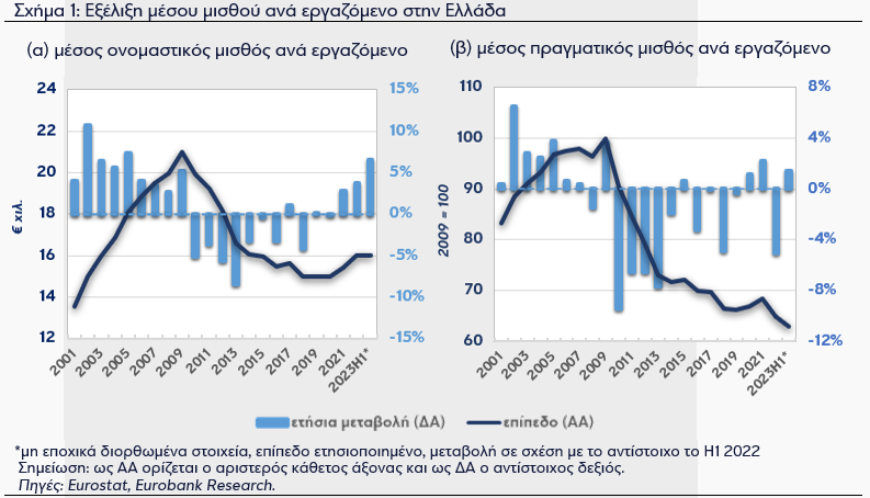 Παρομοίως, έρευνα της τράπεζας Eurobank, που βασίστηκε στα επίμαχα δεδομένα της ΕΛΣΤΑΤ που δόθηκαν στην Eurostat, κατέγραψε μικρή άνοδο των πραγματικών μισθών μεταξύ 2019-2021, αλλά μείωση έκτοτε μέχρι το πρώτο εξάμηνο του 2023, συνολικά φτάνοντας χαμηλότερα από το επίπεδο του 2019.