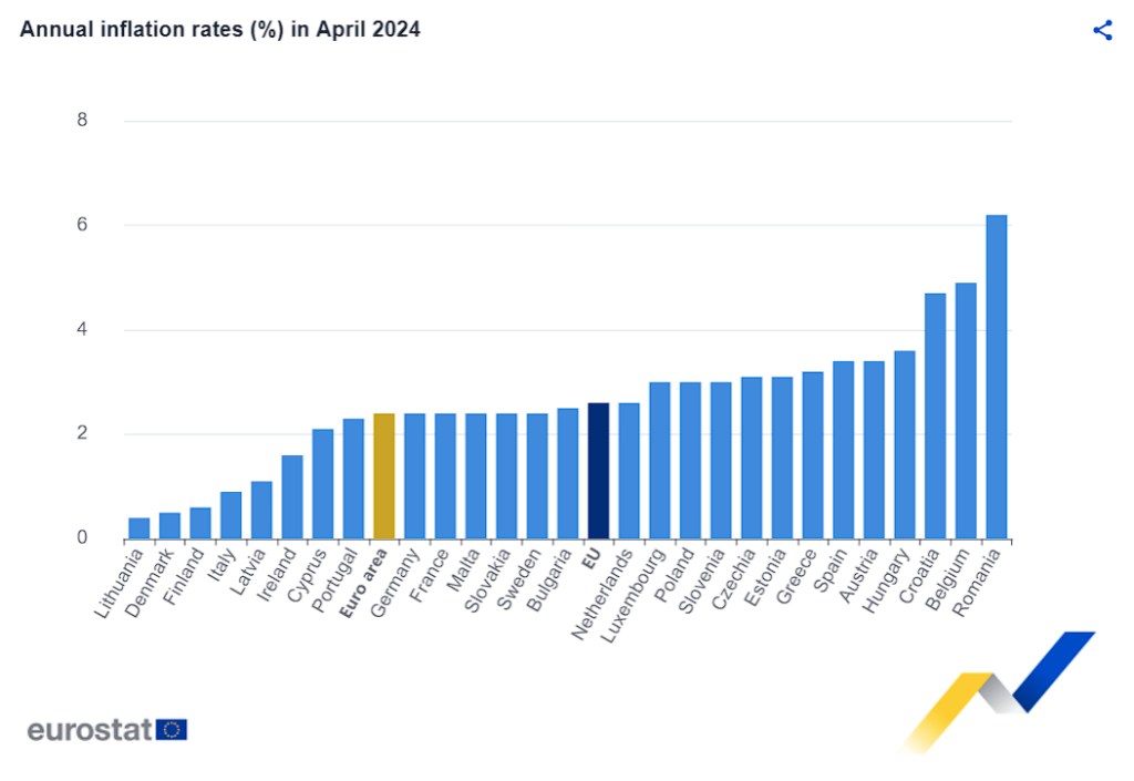 Ετήσιος ρυθμός πληθωρισμού στην ΕΕ μεταξύ Απριλίου 2023-2024. Πηγή: Eurostat, 17/5/2024