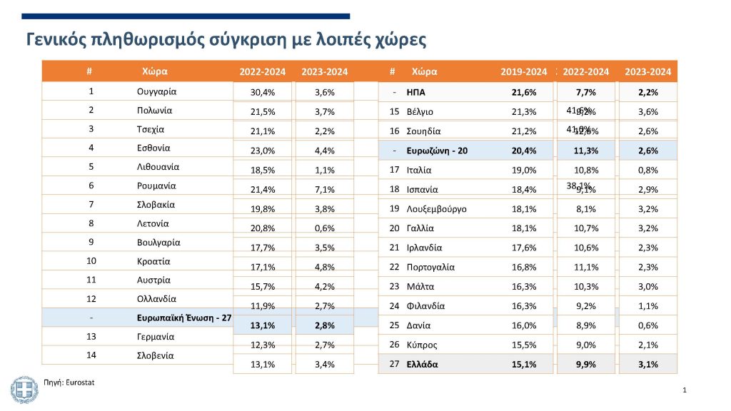 Παύλος Μαρινάκης: Πάμε λίγο να δούμε κάποια δεδομένα. Καταρχάς να πούμε ότι το αφήγημα ότι η Ελλάδα είναι η ακριβότερη χώρα στην Ευρώπη με βάση τα στοιχεία της Eurostat… Έχω αυτόν τον πίνακα εδώ, είναι ο πληθωρισμός με βάση τη Eurostat, σωρευτικά, όλων των χωρών. Αν δείτε ο μέσος όρος της Ευρωπαϊκής Ένωσης σωρευτικά είναι 13.1%, της Ευρωζώνης είναι 20.4%, έτσι, και της χώρας μας είναι 15.1%. Είναι πολύ το 15.1%, αλλά δεν είμαστε πρωταθλητές. Γιατί το λέω αυτό; Γιατί πρέπει να απαντάμε στη σπέκουλα.