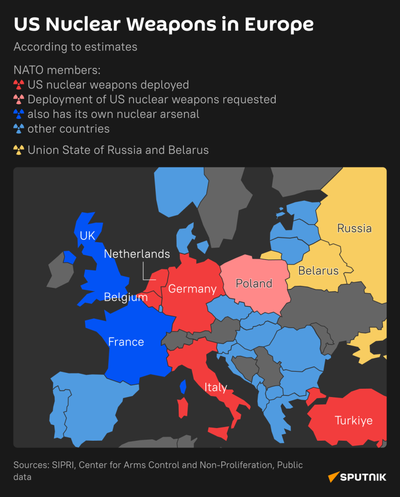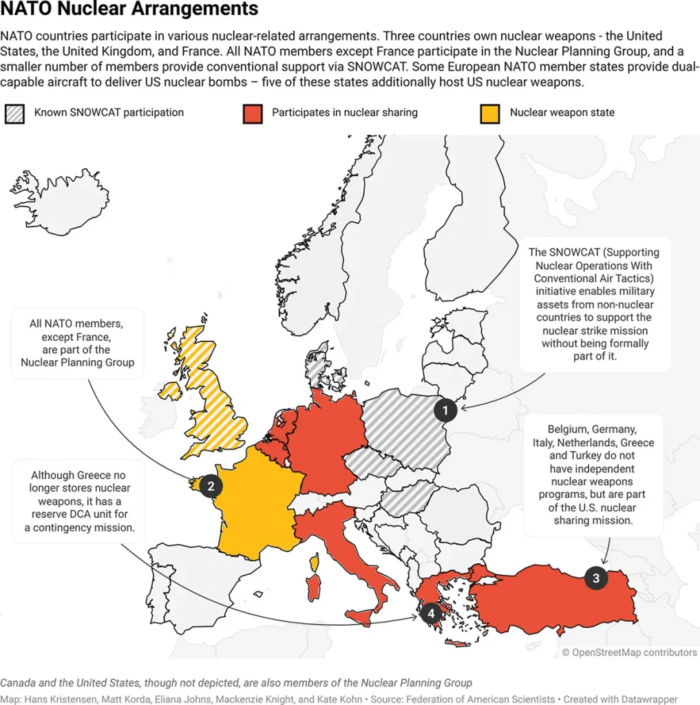 Με περαιτέρω αναζήτηση εντοπίζουμε χάρτη από σχετικό άρθρο που δημοσιεύθηκε στο Bulletin of the Atomic Scientists τον Νοέμβριο του 2023 ο οποίος δείχνει αντίστοιχη εικόνα από χώρες που είναι μέλη του NATO στην Ευρώπη και έχουν πυρηνικά όπλα.