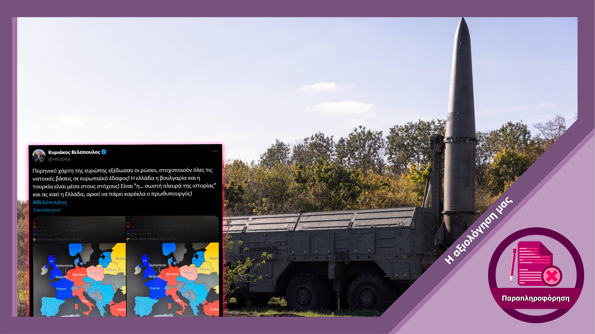 Ο ισχυρισμός του Κυριάκου Βελόπουλου ότι η εικόνα που μοιράστηκε στο X δείχνει στόχους για πυρηνικές επιθέσεις της Ρωσίας, μεταξύ των οποίων είναι και η Ελλάδα, είναι ψευδής. Η εικόνα είναι infographic που δημοσιεύθηκε στο Sputnik τον Μάρτιο του 2023 και δείχνει χώρες στην Ευρώπη που έχουν δικό τους πυρηνικό οπλοστάσιο ή φιλοξενούν πυρηνικά όπλα, όχι στόχους της Ρωσίας. Στο εν λόγω γράφημα, το οποίο επιβεβαίωνεται και από αντίστοιχο χάρτη που δημοσιεύθηκε από τον φορέα Bulletin of the Atomic Scientists, η Ελλάδα εμφανίζεται ως χώρα που δεν φιλοξενεί πλέον πυρηνικά όπλα καθώς μέχρι το 2001 είχε πυρηνικά όπλα των ΗΠΑ στο πλαίσιο συμφωνίας με το ΝΑΤΟ που έλαβε χώρα κατά τον ψυχρό πόλεμο.