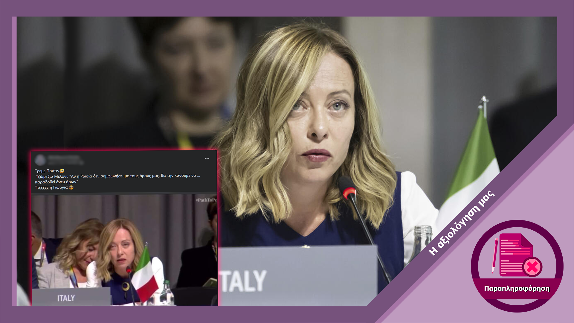Λογαριασμοί στα μέσα κοινωνικής δικτύωσης αναπαράγουν τον ισχυρισμό ότι, στην σύνοδο ειρήνης που έλαβε χώρα στις 15 Ιουνίου 2024, η Πρωθυπουργός της Ιταλίας, Τζόρτζια Μελόνι δήλωσε πως θα αναγκάσει την Ρωσία να παραδοθεί. Ο εν λόγω ισχυρισμός ωστόσο είναι ψευδής, καθώς η Μελόνι δεν αναφέρθηκε σε παράδοση της Ρωσίας σε κανένα σημείο της εισήγησης.