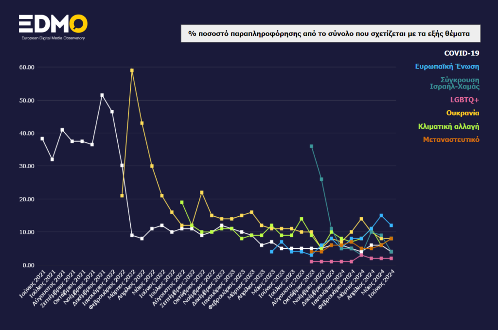 Από αυτά τα άρθρα, 209 (12%) αφορούσαν παραπληροφόρηση σχετικά με την Ευρωπαϊκή Ένωση, 148 (8%) παραπληροφόρηση σχετικά με τον πόλεμο στην Ουκρανία, 146 (8%) παραπληροφόρηση που σχετίζεται με την κλιματική αλλαγή, 135 (8%) παραπληροφόρηση σχετικά με θέματα μετανάστευσης, 78 (4%) παραπληροφόρηση που αφορούσε την COVID-19, 67 (4%) παραπληροφόρηση σχετικά με τον πόλεμο μεταξύ Ισραήλ και Χαμάς και 39 (2%) παραπληροφόρηση κατά της ΛΟΑΤΚΙ+ κοινότητας και θεμάτων που αφορούσαν έμφυλα ζητήματα.