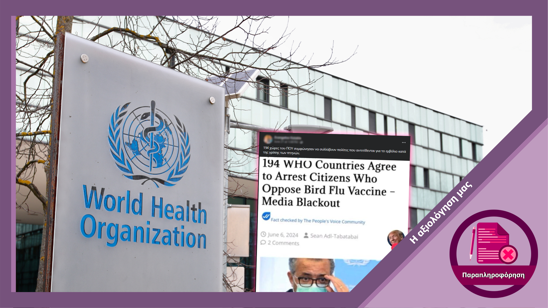 Ο ισχυρισμός ότι κράτη-μέλη του Παγκόσμιου Οργανισμού Υγείας συμφώνησαν σε σύλληψη πολιτών που αρνούνται τον εμβολιασμό για την γρίπη των πτηνών είναι ψευδής. Ο εν λόγω ισχυρισμός ξεκίνησε από άρθρο στην συνωμοσιολογική σελίδα The Peoples Voice η οποία παρέθεσε ως πηγή το κείμενο με τις τροποποιήσεις στους Διεθνείς Υγειονομικούς Κανονισμούς του ΠΟΥ που τέθηκαν σε εφαρμογή την 1η Ιουνίου 2024. Στο κείμενο δεν γίνεται καμία αναφορά στη γρίπη των πτηνών ή σε επιβολή εμβολιασμού πολιτών με οποιονδήποτε τρόπο.
