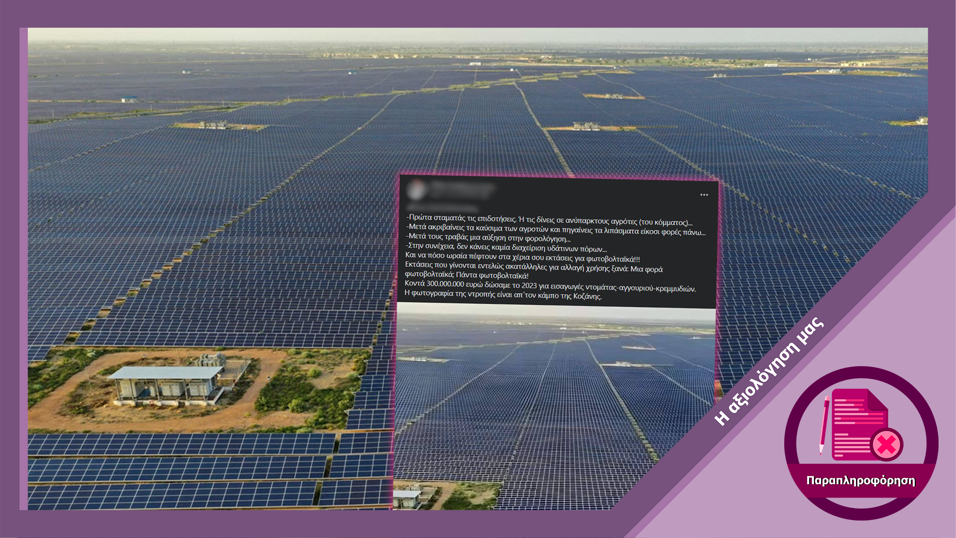 Η φωτογραφία που αναπαράγουν οι εξεταζόμενοι λογαριασμοί στα μέσα κοινωνικής δικτύωσης δεν δείχνει ηλιακό σταθμό στον κάμπο της Κοζάνης, αλλά το μεγαλύτερο ηλιακό πάρκο στον κόσμο το οποίο βρίσκεται στο Ρατζαστάν της Ινδίας. Ο σταθμός έχει ικανότητα παραγωγής 2,245 μεγαβατ και συνολική έκταση 56 τετραγωνικά χιλιόμετρα, ενώ συγκριτικά ο μεγαλύτερος σταθμός στην Ελλάδα έχει έκταση 4.5 τετραγωνικά χιλιόμετρα.