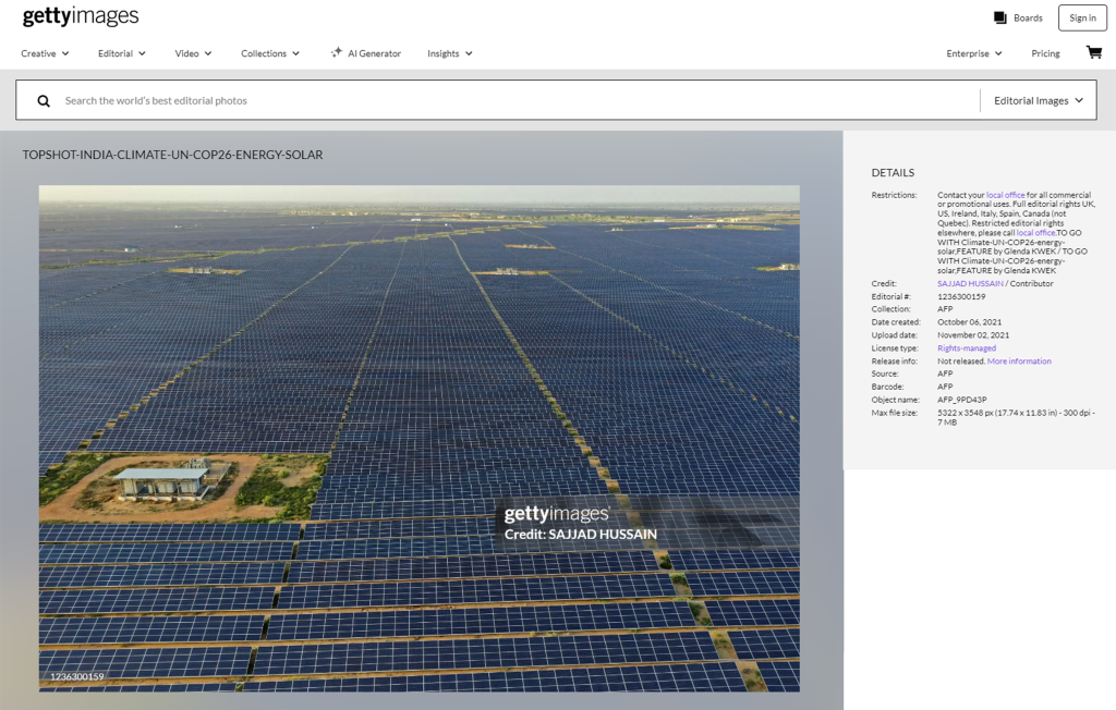 Μέσα από αντίστροφη αναζήτηση εικόνας εντοπίσαμε την αρχική αναπαραγωγή της φωτογραφίας, η οποία δεν δείχνει ηλιακό πάρκο στον κάμπο της Κοζάνης. Πρόκειται για το ηλιακό πάρκο “Bhadla Solar Park” στην πολιτεία Ρατζαστάν της Ινδίας, η κατασκευή του οποίου ολοκληρώθηκε το 2018, και μέχρι το 2023 ήταν το μεγαλύτερο ηλιακό πάρκο στον κόσμο με ικανότητα παραγωγής 2,245 μεγαβατ. Την φωτογραφία που εντοπίζουμε στις επίμαχες αναρτήσεις τράβηξε ο φωτορεπόρτερ Sajjad Hussain για το γαλλικό πρακτορείο AFP το 2021.