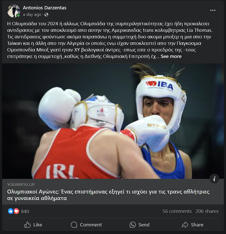 Μεγάλη απήχηση γνώρισαν και οι τοποθετήσεις του παιδιάτρου Αντώνη Δαρζέντα. Στην πρώτη εξ αυτών, έκανε λόγο για συμμετοχή πυγμάχου στη γυναικεία κατηγορία, «ενώ ήταν βιολογικός άντρας με ΧΥ χρωμοσώματα». Στην υπόλοιπη ανάρτηση, αναδημοσίευσε παλιότερη ανάρτησή του που επικαλούνταν επιστημονικά στοιχεία για τη μεγάλη διαφορά αθλητικής απόδοσης γυναικών και ανδρών, γεγονός που συμπέρανε ότι θα έπρεπε να αποκλείσει τον διαγωνισμό μεταξύ φύλων, καθώς και τη συμμετοχή τρανς γυναικών στη γυναικεία κατηγορία. Η εν λόγω ανάρτηση αναδημοσιεύτηκε από το μέσο ygeiamou.gr.
