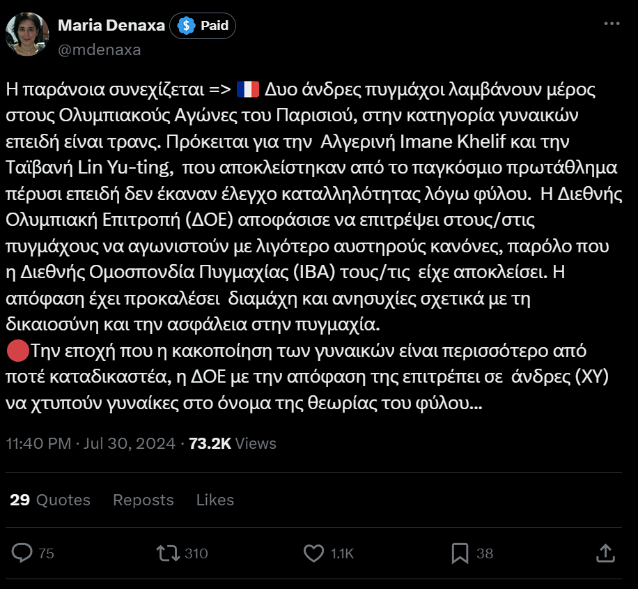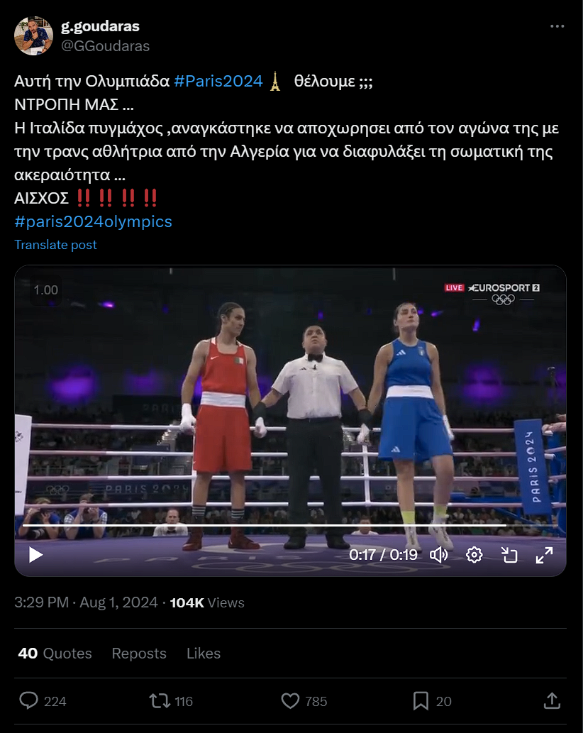 Είναι σκόπιμο να σημειωθεί επίσης ότι μία μέρα πριν τον αγώνα μεταξύ Khelif και Carini, ο Kremlev είχε αναρτήσει ιδιαίτερα καυστικά σχόλια για τις πολιτικές συμπεριληπτικότητας της IOC.