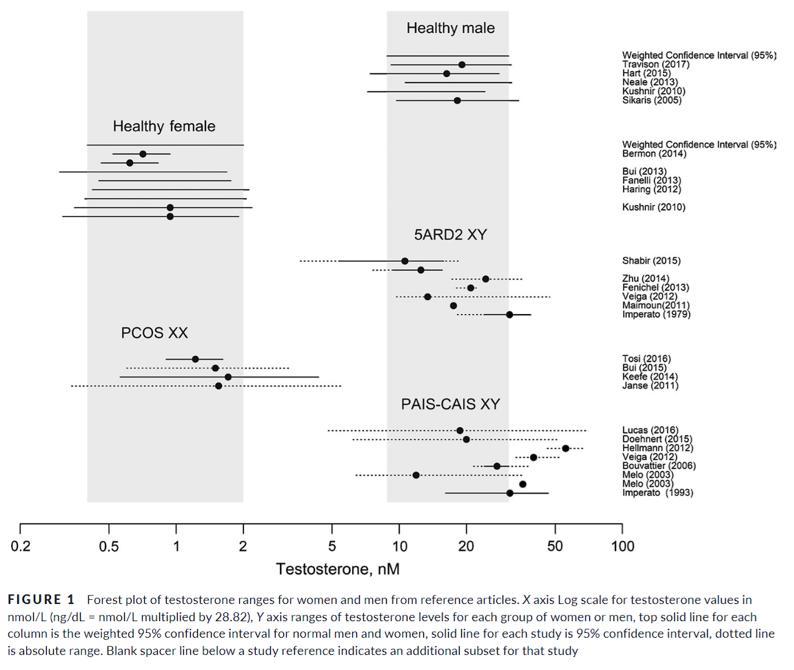 Η εξέταση χρωμοσωμάτων είχε υπάρξει αμφιλεγόμενη σε μεμονωμένα περιστατικά που αφορούσαν αθλητές με DSDs, αλλά αυτά ήταν σπάνια, λόγω και της σπανιότητας εμφάνισης αυτών των περιπτώσεων. Από την άλλη, τα τεστ τεστοστερόνης οδήγησαν σε πολύ περισσότερα αμφιλεγόμενα περιστατικά. Αυτό επειδή ένα 5-10% των γυναικών εμφανίζει φυσικά υπεραυξημένα επίπεδα τεστοστερόνης (υπερανδρογονισμό), που μπορεί να προσεγγίσουν αυτά των συνηθισμένων ανδρών7Clark, Richard V., et al. “Large divergence in testosterone concentrations between men and women: Frame of reference for elite athletes in sex-specific competition in sports, a narrative review.” Clin. Endocrinol., vol. 90, no. 1, 1 Jan. 2019, pp. 15-22, doi:10.1111/cen.13840. Αρχειοθετημένο εδώ.. Παράλληλα, DSDs όπως η έλλειψη ευαισθησίας στην τεστοστερόνη, μπορούν να προκαλέσουν μέχρι και υψηλότερα επίπεδα της σε άτομα που μεγάλωσαν ως γυναίκες, σε σχέση με έναν άντρα.